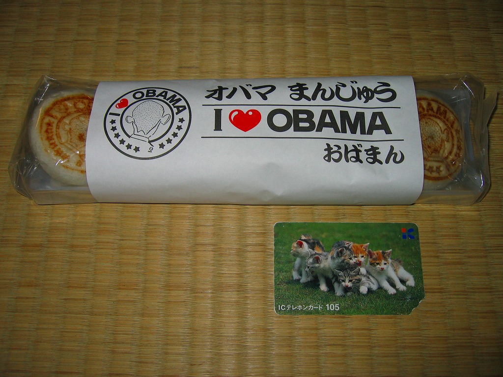 焼き印や掛紙のマークは、肖像権に配慮して後ろ姿に変えたのだそうな。その他様々な地域おこしグッズが登場したが、この饅頭が現時点では筆頭格だろう。地元の駅でもスーパーでも観光施設でも買え、デパートの催事にも出品されたりしている。価格は2009年の購入時で630円、2017年時点で650円。2017年1月にオバマ大統領が任期を満了し退任した後も、この饅頭は売り続けられる。通販でも買える。