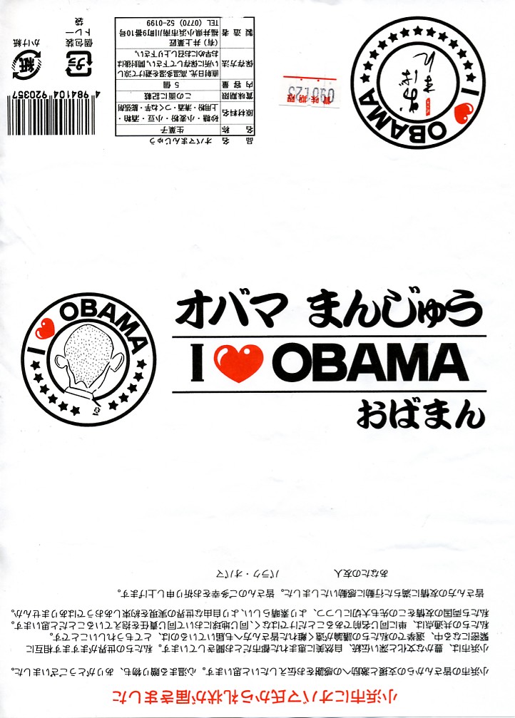 大統領予備選の激戦が日本でもテレビで大きく取り上げられる中、有力候補者と同じ名前を持つ福井県小浜市では、市長がオバマ陣営へプレゼントを送付したり、「オバマ候補を勝手に応援する会」なる地域グループが出現、この騒動もテレビに乗って全国へ宣伝された。地元の菓子店は主力の酒饅頭をアレンジして、このような商品を売り出した。