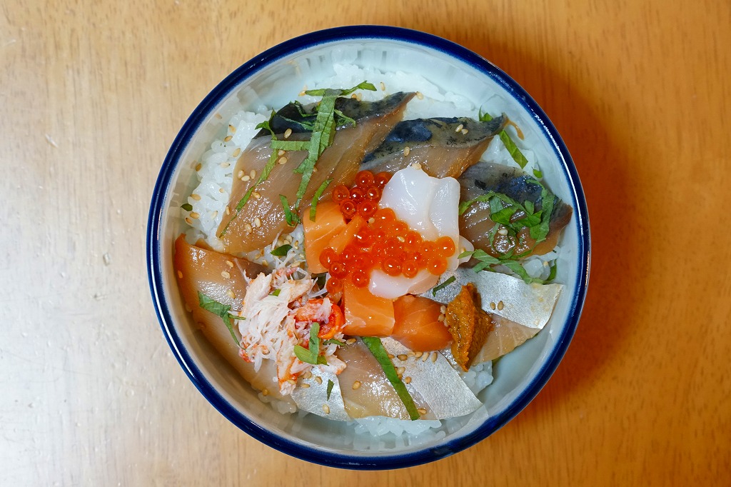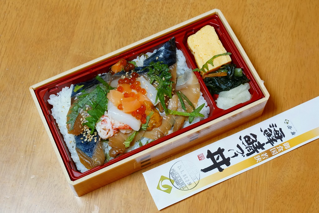 2021(令和3)年1月の京王百貨店の駅弁大会で実演販売。 白飯の上を寒サバの漬けで覆い、大葉、カニ、ウニ、イクラ、サーモン、白ごまで彩り、漬物や玉子焼を添える。脂が乗ったり、みずみずしさのある、散らされた具の、海の幸の数々がうまい。コロナ禍で例年になく空いていた催事場で、行列ができる人気だった。