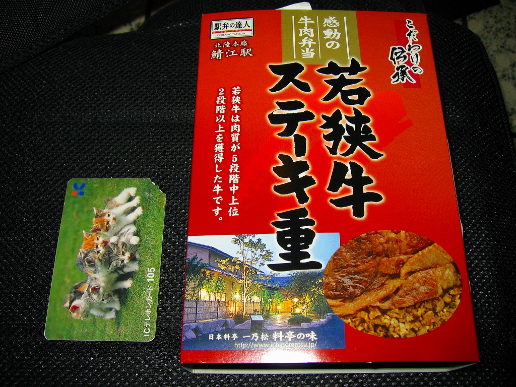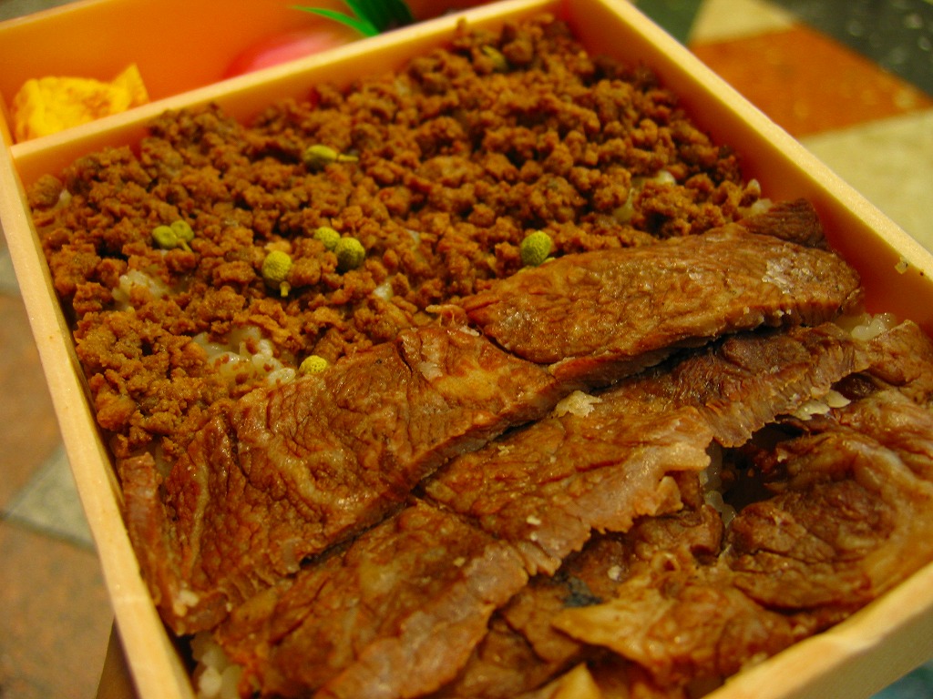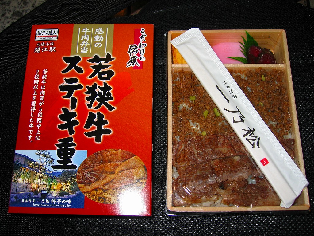 中身は白御飯の上に牛そぼろと牛ステーキ3切れを載せて、蒲鉾、玉子焼、柴漬けを添えた牛丼。ぱさついた感じの牛肉の風味は可もなく不可もなし。分量を考えるとえらく高価だが、5段階中上位2段階以上の若狭牛を使っているとは書かれている。