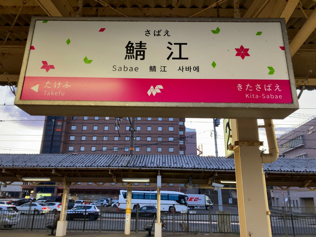 大阪駅から特急列車で約2時間。鯖江市は福井県の中部に位置する人口約7万の門前町。メガネフレームの国内生産を独占することで知られる、めがねの街。駅弁は過去にも公式にも存在しないが、駅のコンビニ(2024年1月閉店)で北陸本線の駅弁の一部が買えたほか、スーパーやデパートの駅弁催事で鯖江駅の駅弁と称する弁当が売られた。1896(明治29)年7月15日開業、福井県鯖江市日の出町。