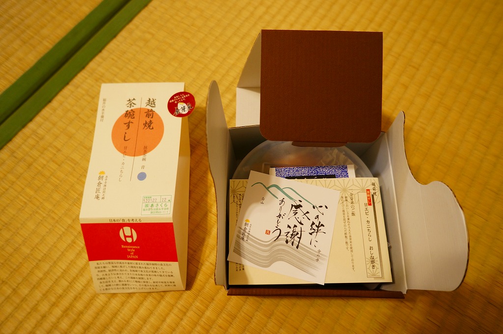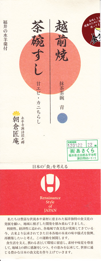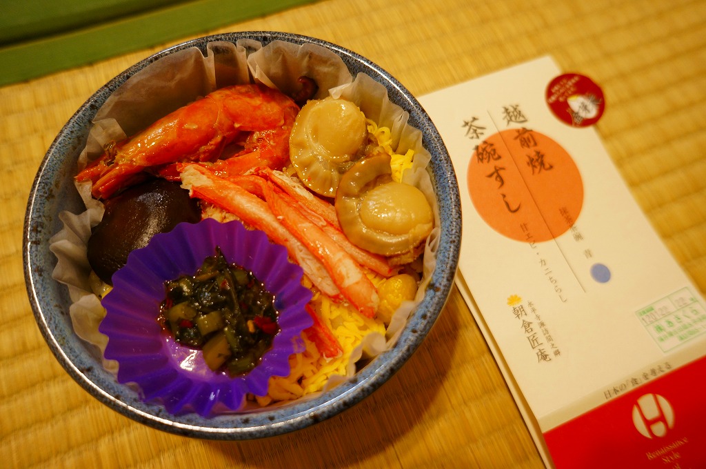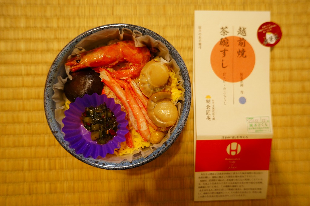 2011(平成23)年9月に北陸自動車道南条サービスエリアの速弁として発売、これが京王百貨店駅弁大会と阪神百貨店の駅弁大会で、JR北陸本線武生駅の駅弁として販売されたもの。「日本古窯弁当シリーズ」とまったく同じ越前焼の茶碗を使用、しおりや掛紙を添えてボール紙の箱に詰める。中身は金芽米の御飯を錦糸卵、カニほぐし身、有頭海老、ホタテ煮で覆い、シイタケやわさび漬などを添え、水ようかんを別添するもの。