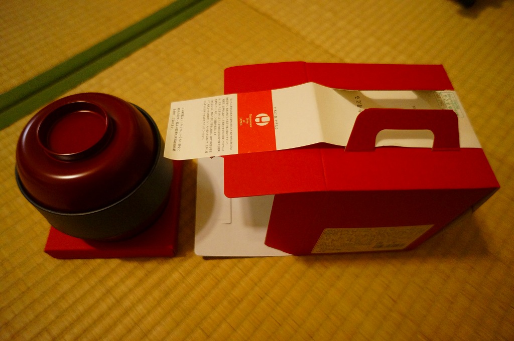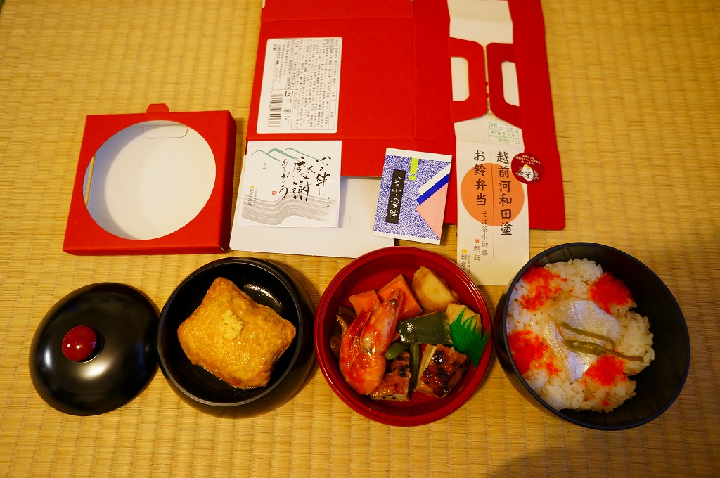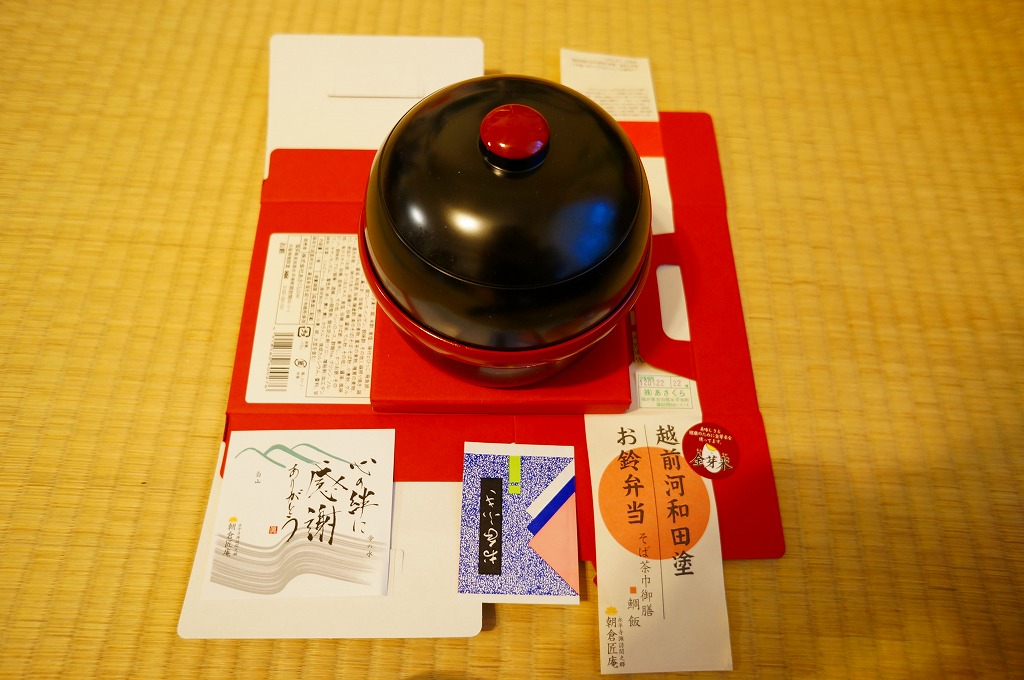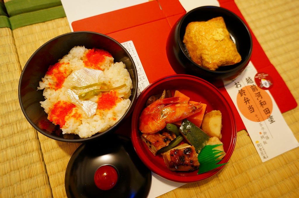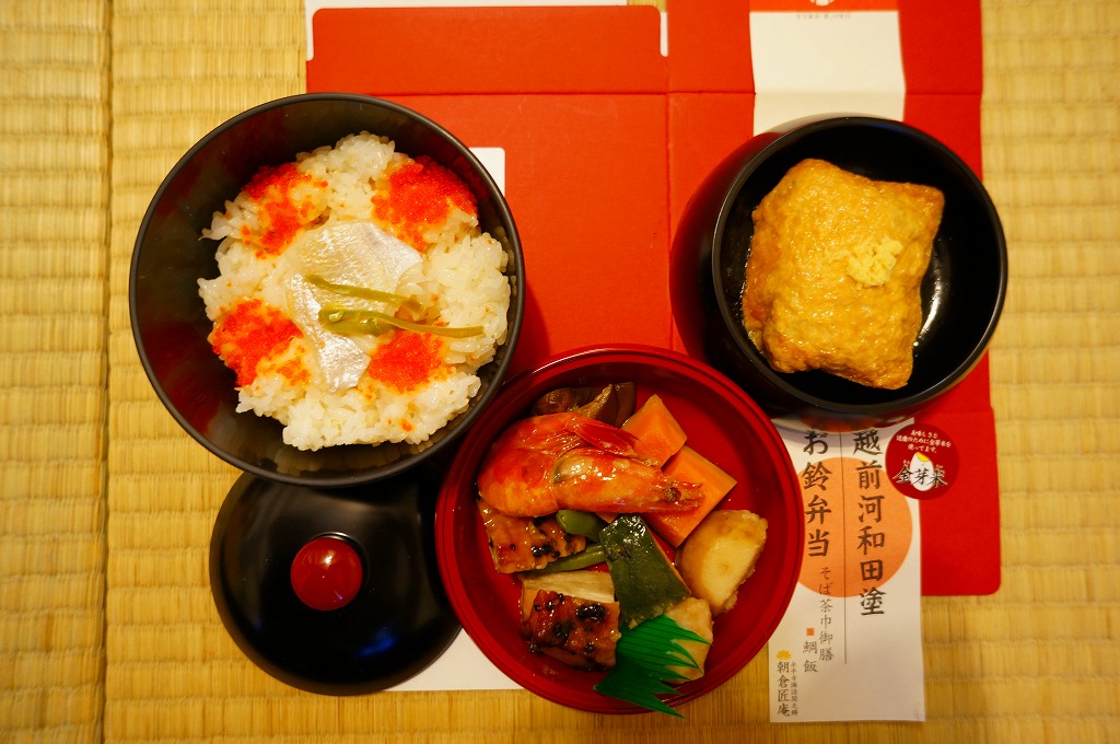 2011(平成23)年12月下旬に福井鉄道の越前武生駅で2種を同時に発売した、福井鉄道史上初の駅弁とされる。越前河和田塗というプラスティック製の黒い椀を、赤いボール紙製容器に収める。容器は二層構造、さらに下層をプラ製トレーで重層にしており、下段にタイやトビッコの御飯、中段に有頭海老、カボチャ煮、サトイモ煮、鶏照焼、シイタケ煮などの粒の大きいおかず、上段に茶きんそば。同時登場の下記商品と容器は違うが中身はほぼ同じ、値段も同じ、実態もおそらく同じ。駅弁と名乗らなければ、下段の鯛飯も中段の茶巾も上段の煮物もおいしくいただける。
