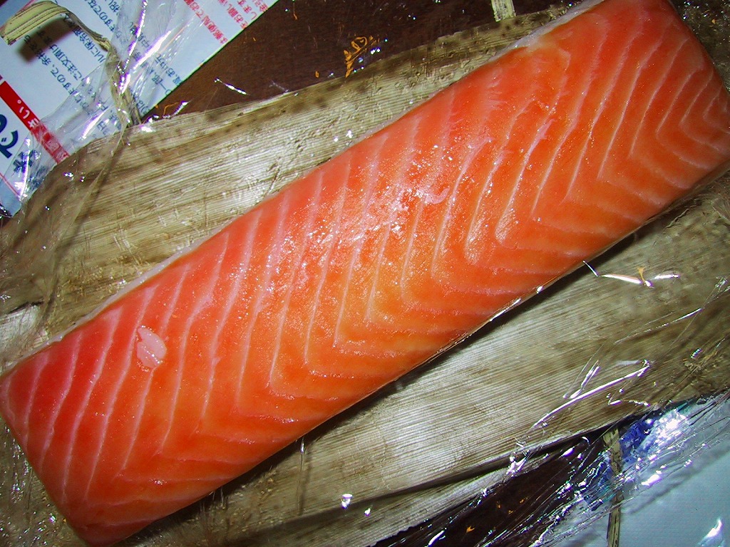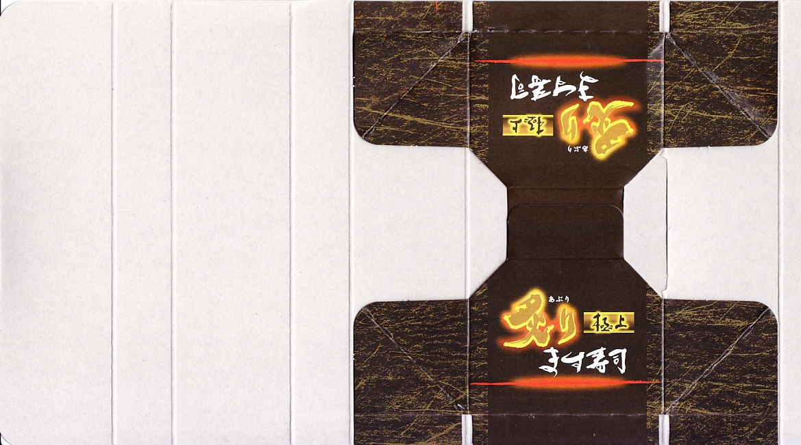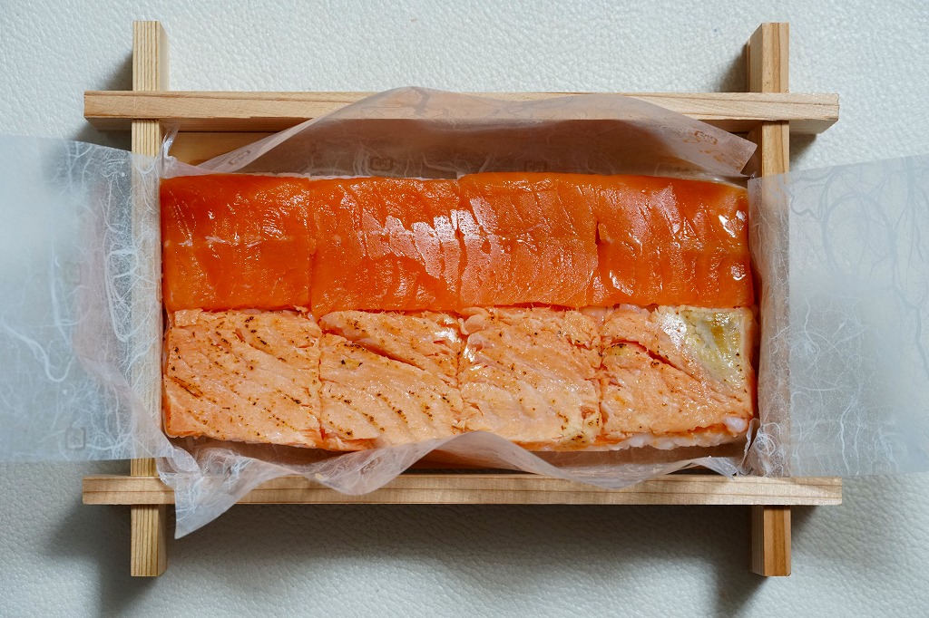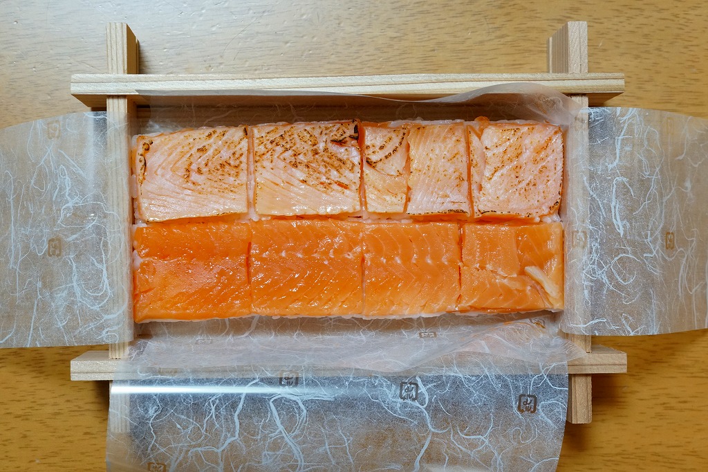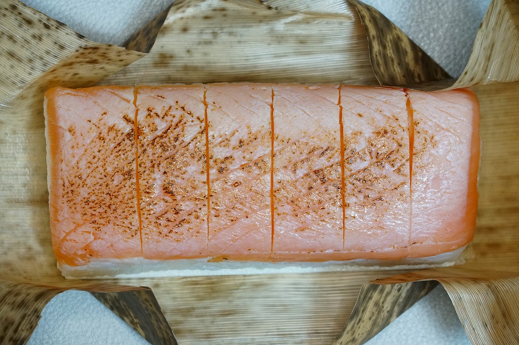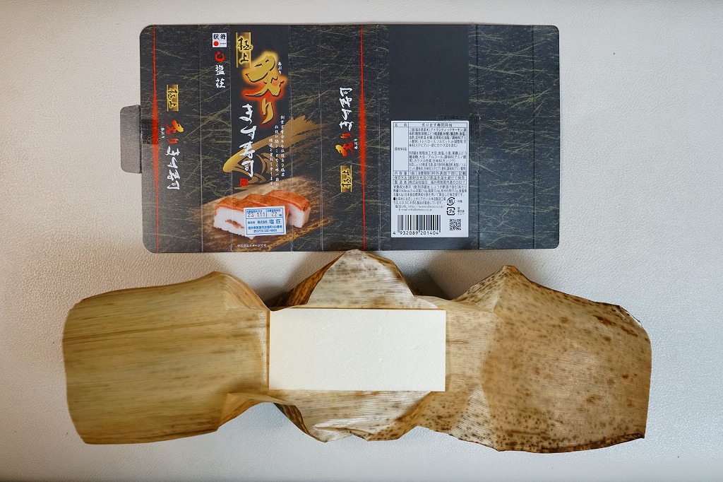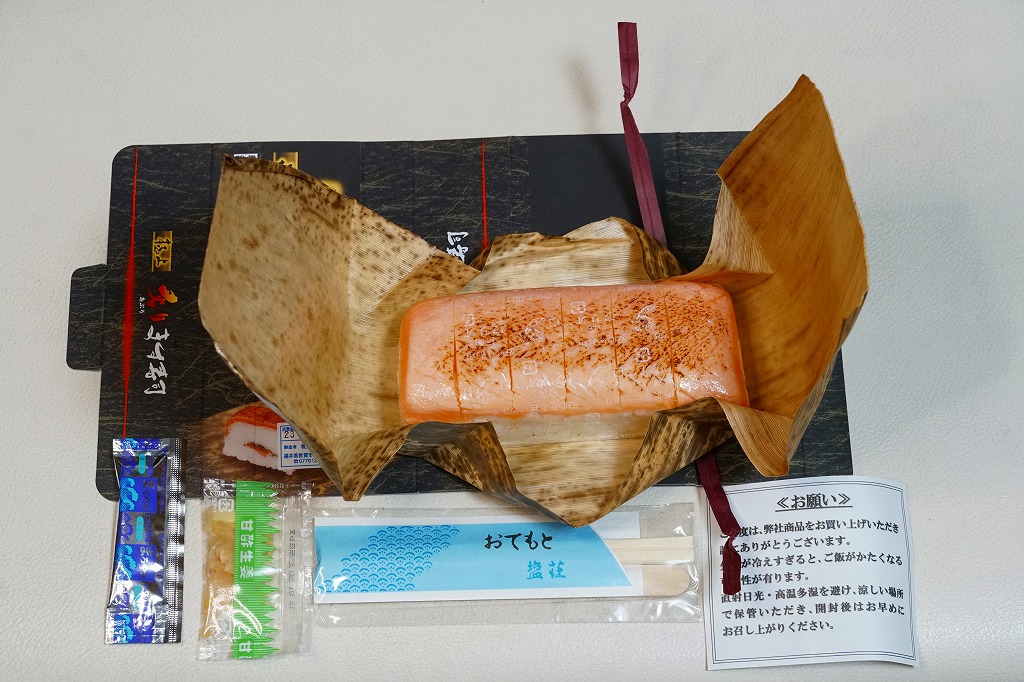 2010(平成22)年の秋から、様々な値段で断続的に販売か。中身のイメージ写真と明るい商品名を描いた黒い紙容器に、一人前の棒寿司を1本収める姿は変わらないようだ。酢飯に炙ったアトランティックサーモンを貼り付け、中にもサーモンと昆布を仕込み、プラ製の板に載せて笹の葉を巻く。薄く少ない身を炙りと脂の乗りでカバーした、お手軽においしいマス寿司。過去には身がこの何倍も厚く、値段も1,700円と高かったらしい。