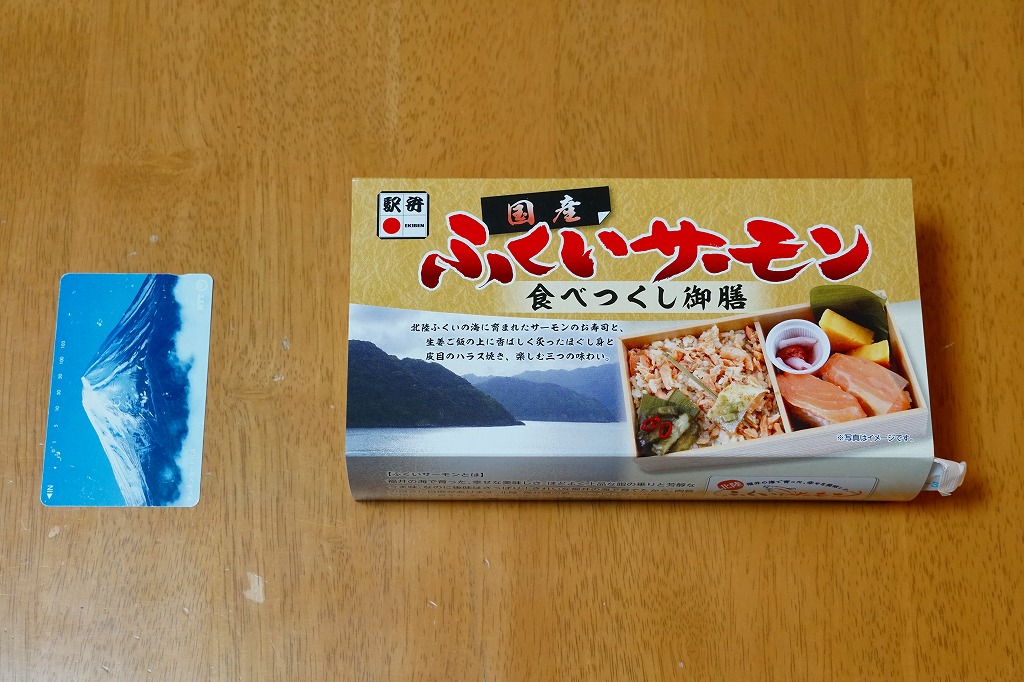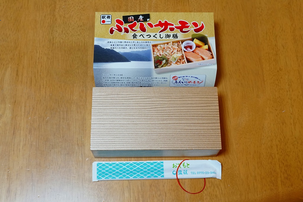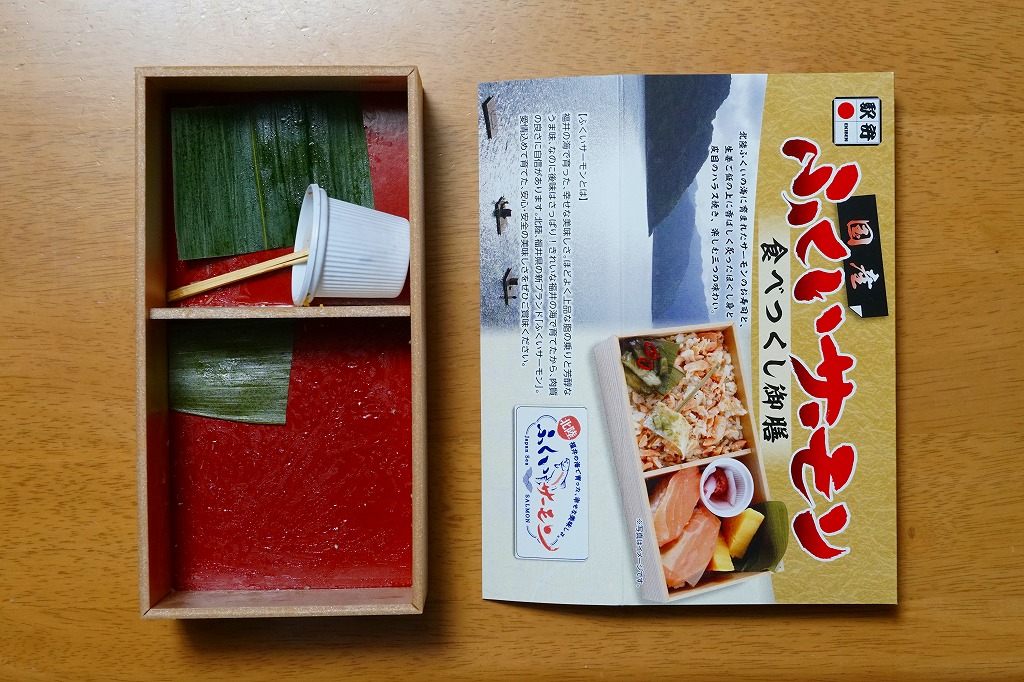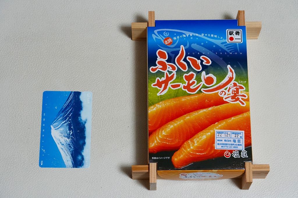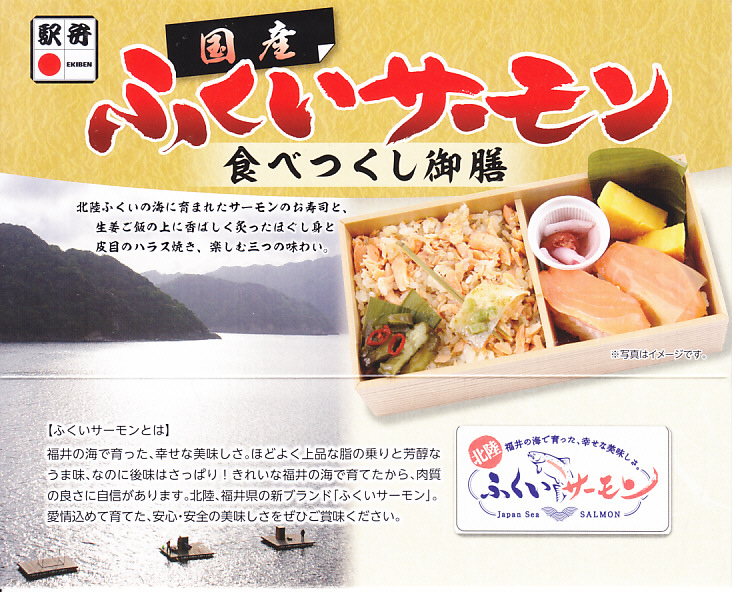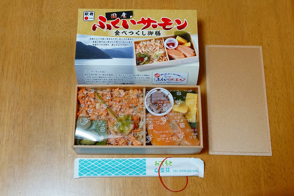 2020(令和2)年1月の発売か。現地でなく駅弁催事向けに出荷する商品である可能性がある。元祖鯛鮨と同じような正方形の押寿司が、サーモンが4個と炙りサーモンが4個、木箱の中に並べられる。「ふくいサーモン」は、福井県内で海面養殖されたトラウトサーモンつまりニジマスで、福井県庁と組合や企業が2014(平成26)年から研究を始めて2017(平成29)年から出荷されるブランド魚。鮭でなくサーモンの駅弁が、各地で徐々に出始めていると思う。価格は2020年の発売時や2022年の購入時で1,280円、2023年時点で1,300円。