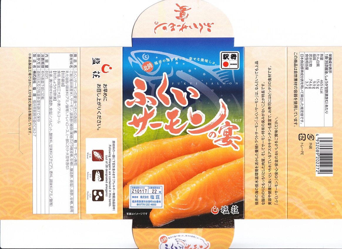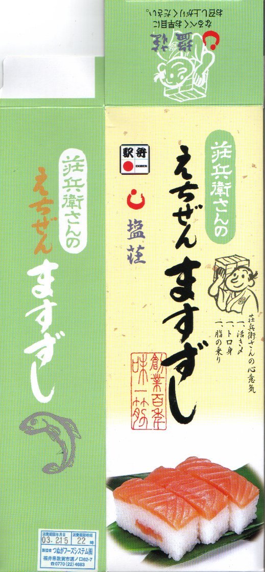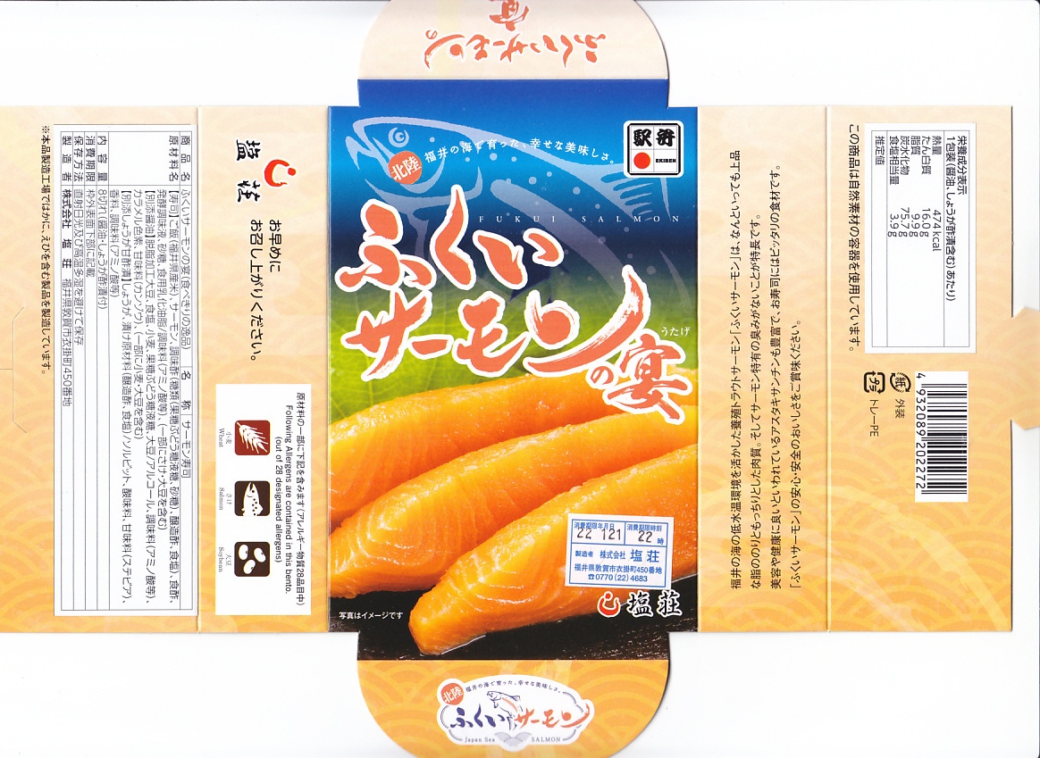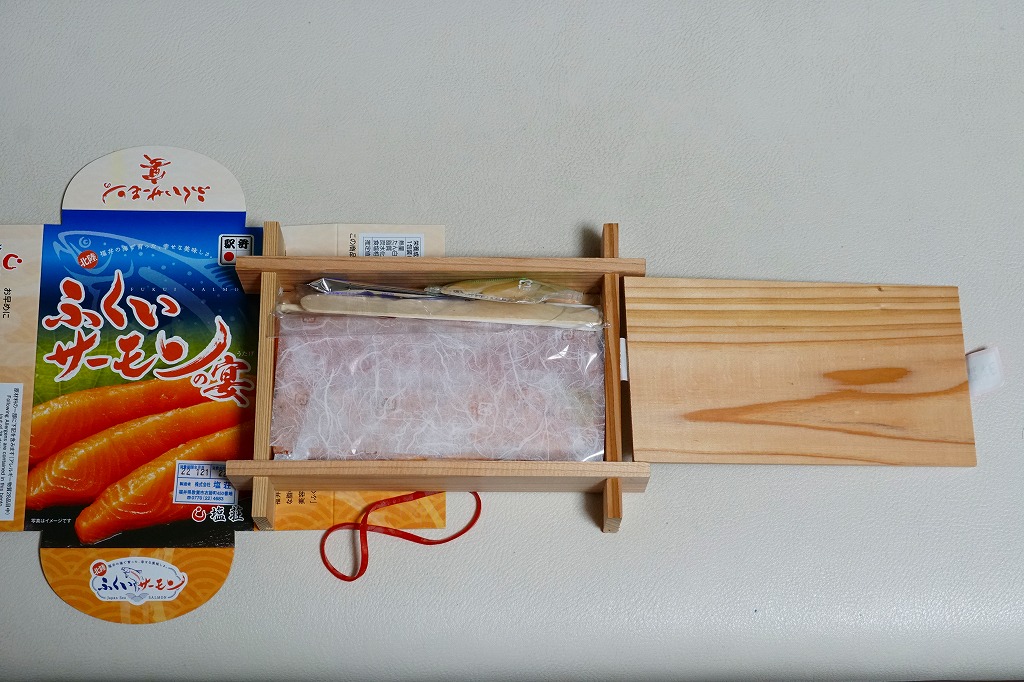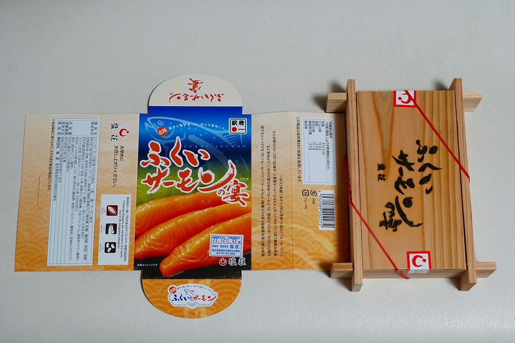 2020(令和2)年1月の発売か。現地でなく駅弁催事向けに出荷する商品である可能性がある。元祖鯛鮨と同じような正方形の押寿司が、サーモンが4個と炙りサーモンが4個、木箱の中に並べられる。「ふくいサーモン」は、福井県内で海面養殖されたトラウトサーモンつまりニジマスで、福井県庁と組合や企業が2014(平成26)年から研究を始めて2017(平成29)年から出荷されるブランド魚。鮭でなくサーモンの駅弁が、各地で徐々に出始めていると思う。価格は2020年の発売時や2022年の購入時で1,280円、2023年時点で1,300円。