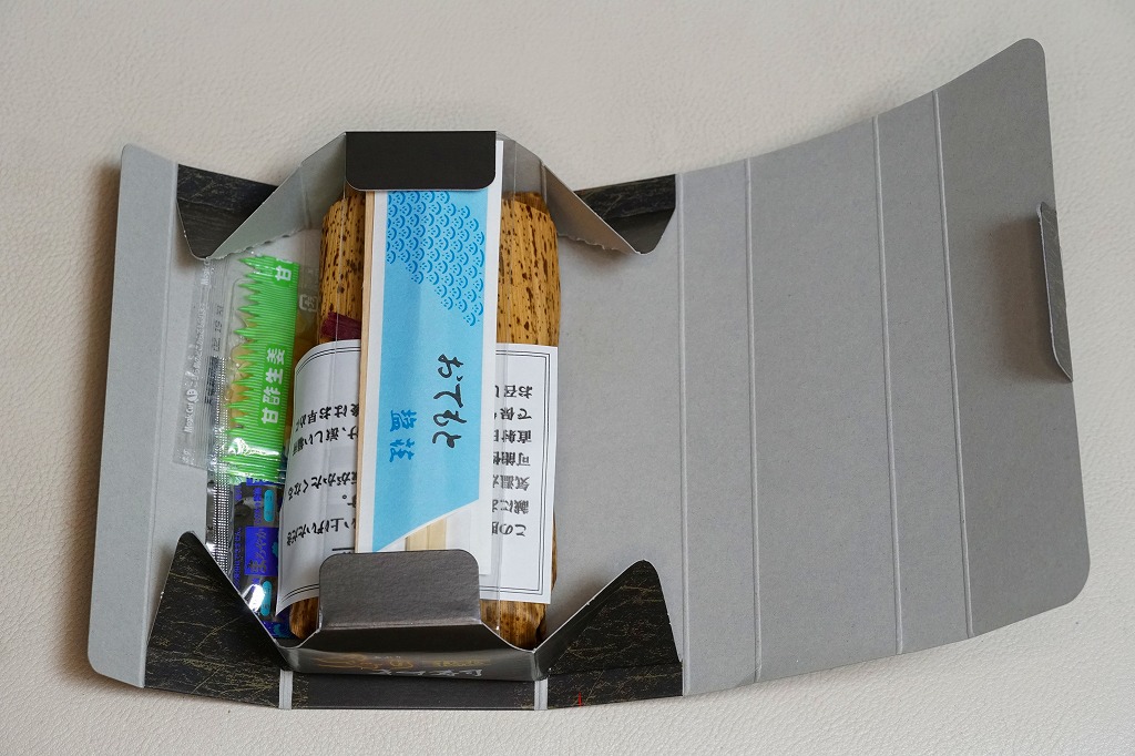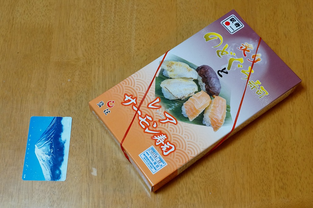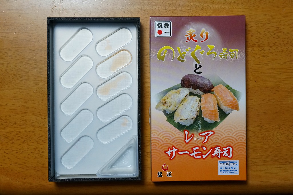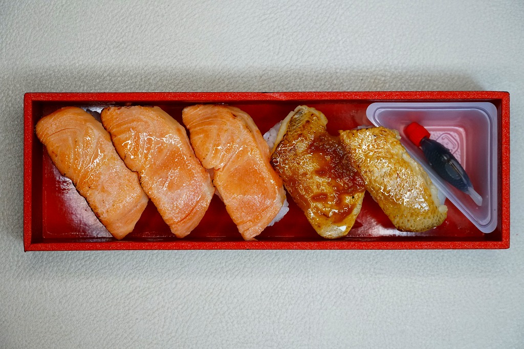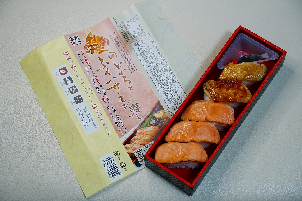 秋冬の駅弁大会シーズンに向けた、2018(平成30)年秋の新商品か。炙りのどぐろ寿司を4個、レアサーモン寿司を5個、しそ巻きを1個、甘酢生姜と醤油を、白いプラ製トレーのくぼみにひとつずつ収める。20年から30年くらい前には、横浜駅のシウマイや小田原駅の小鯵押寿司などで、こういう詰め方をしていたが、今では珍しいタイプだと思う。小粒な握り鮨の風味は固め。2022年春までの販売か。