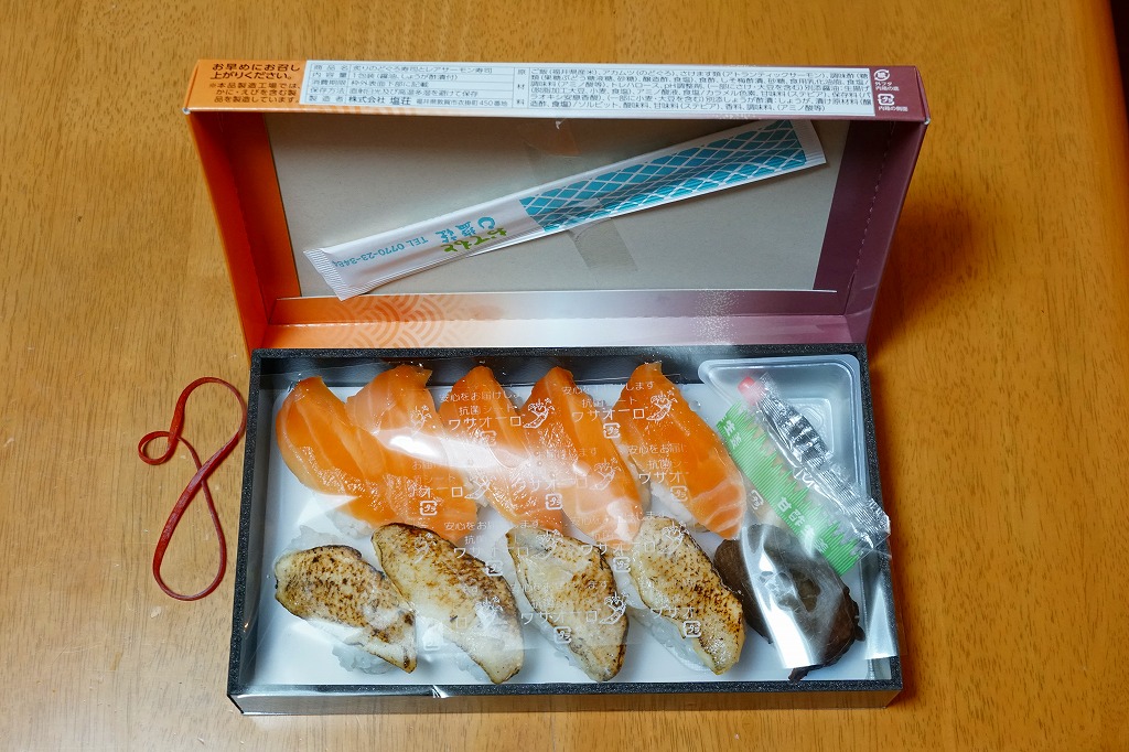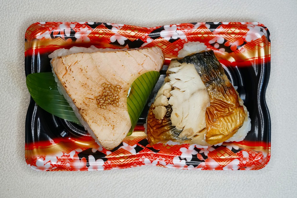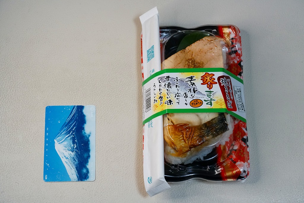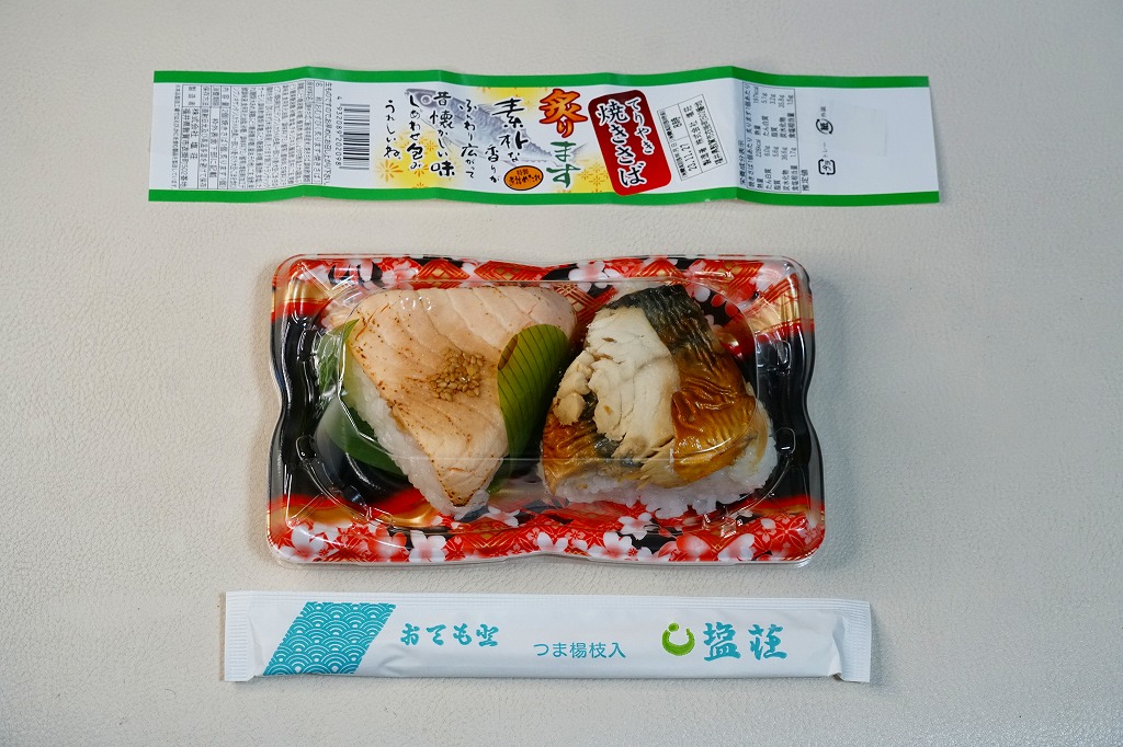 2018(平成30)年までには敦賀駅で発売か。上記の商品名は紙帯の記載から採ったが、売店では「ちょいとおすし(炙りますと焼さばセット)」とあり、レシートには「ちょいとすしセット」とある。過去には紙帯に「ちょいとおすし」と書いていたらしい。そんな小さな惣菜寿司向けプラ容器に、具を上面に載せた三角おむすびをふたつ、焼きさばと炙りますをひとつずつ収める。つまり、具だくさんにもほどがある焼き魚のおにぎりがふたつ。これがうまくないはずがない。大阪や東京へ輸送される敦賀駅弁とはまるで異なる、現地での姿。紙帯に書いてあった「特製煮詰めたれ」は、炙りますに少しかかっていたものか。