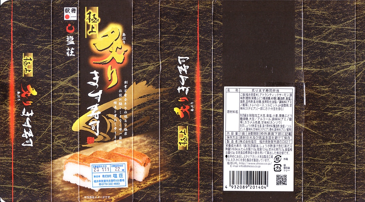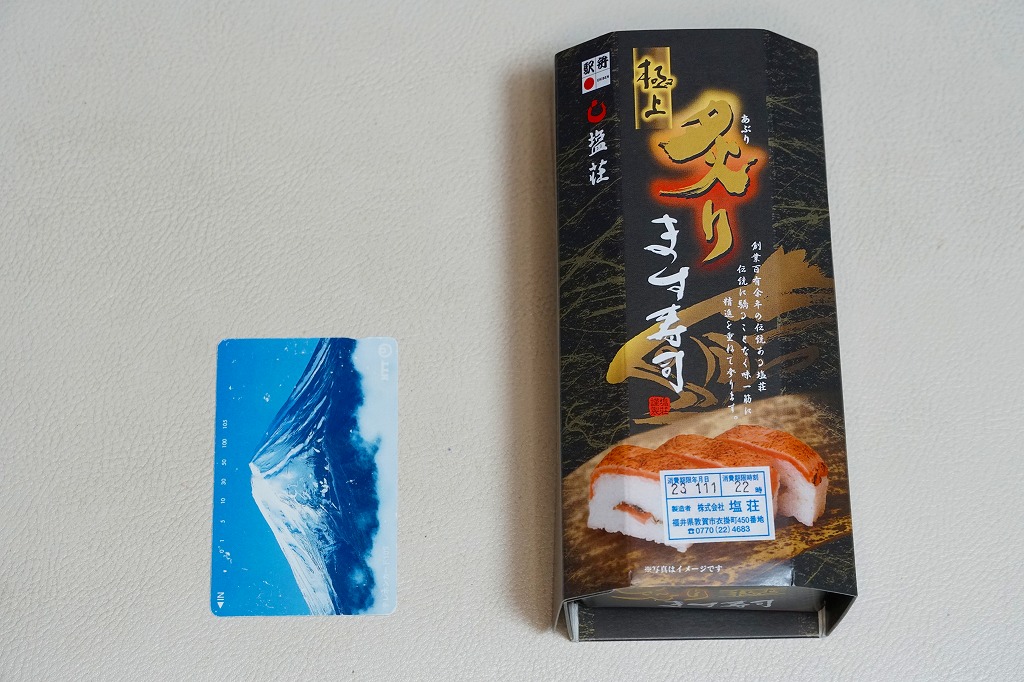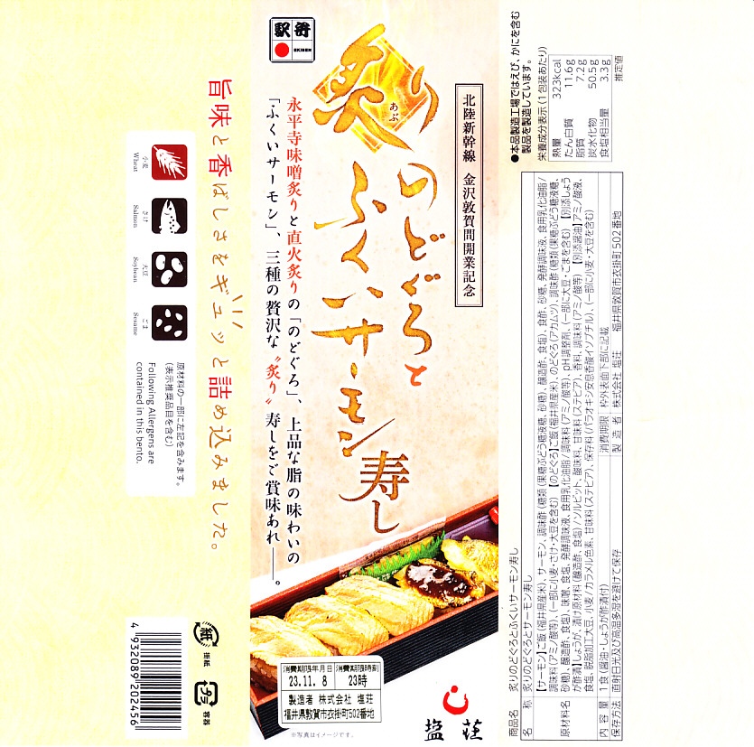 北陸新幹線金沢敦賀間開業記念として、その半年前の2023(令和5)年10月に敦賀駅や東京駅で発売、同月からのJR東日本の駅弁キャンペーン「駅弁味の陣2023」にエントリー。商品名と中身の写真を載せた掛紙を巻く細長い容器に、永平寺味噌炙りと直火炙りののどぐろを各1個と、ふくいサーモン3個で5個の握り寿司を並べ、醤油を添える。5年前から駅弁催事に出ている「炙りのどぐろ寿司とレアサーモン寿司」の、中身を半減して値段を7割にした感じ。駅舎の建て替えで存在感を失った、客が頑張って探さないと見つからない場所でしか買えなくなった敦賀駅弁は、新幹線で復活できるだろうか。