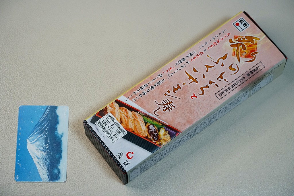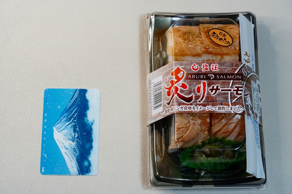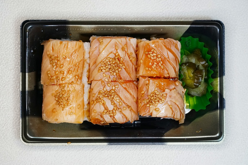 中身は小さな円筒状の白飯に、タレと白ごまをまとうアトランティックサーモンの炙りを半分巻き付けたものを6個並べ、きゅうりの漬物を添えるもの。飯に比して厚みがあり脂が乗るサーモンとたっぷりの甘いタレで、もう少し御飯が欲しくなるうまさ。一緒に買った幕の内弁当と同じくらいの値段がしても欲しくなる軽食。駅弁売店の立地から、この駅弁を敦賀駅で見つけることが難しそう。