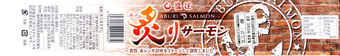 福井県敦賀市の観光施設「敦賀赤レンガ倉庫」の開館を記念して、2015(平成27)年10月に「敦賀赤レンガ倉庫リニューアル記念弁当」(1,080円)の名で発売。半年後の2016年6月までに、その中身から御飯と漬物を抜き出し、この「炙りサーモン」の名で発売。小さなプラ製の惣菜容器に巻いた掛紙には、煉瓦の模様と商品名などとともに「敦賀赤レンガ倉庫をイメージして創作しました」と記す。