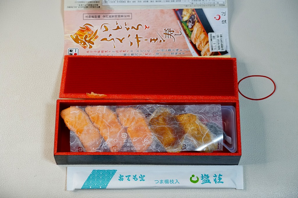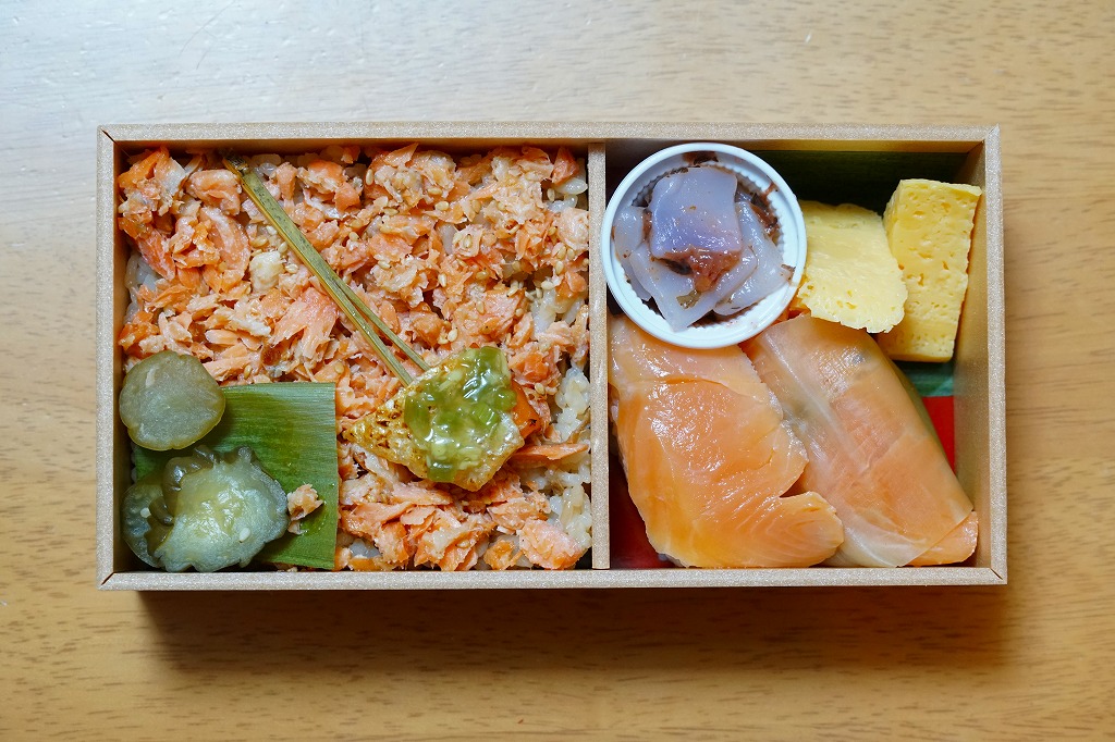 2021(令和3)年1月の京王百貨店の駅弁大会で購入。どうもこれは駅弁大会専用商品で、ほぼスーパーの催事向けに、2018(平成30)年の秋から出荷されている商品であるらしい。白飯をサーモンのフレークで覆い、わさびを付けた焼きハラス片ときゅうり漬を添え、サーモンのにぎり寿司2個、玉子焼2切れ、こんにゃく土佐煮カップも添える。鮭弁当でなくサーモン弁当で、風味は鮭より柔らかめ。3シーズン販売し、2021年春に終売か。