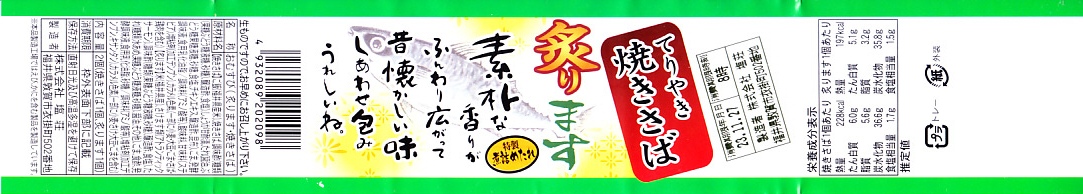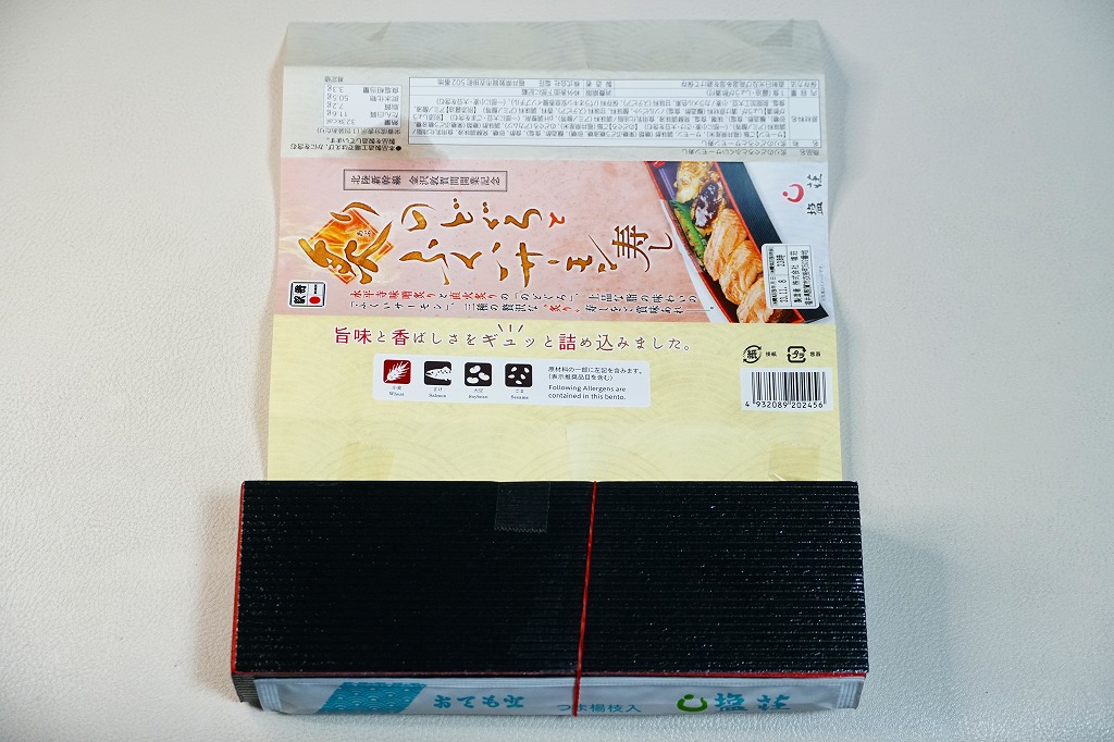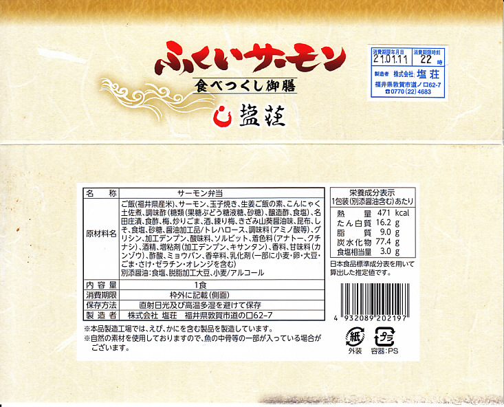 2021(令和3)年1月17日に購入した、敦賀駅弁のボール紙。上記の翌年のものと、絵柄も中身も値段も変わらない。よく見比べると翌年のものは、食品表示のうち原材料名の書き方が変わり、2020年12月の文部科学省の日本食品標準成分表の改訂で栄養成分表示の数値が変わり、2020年9月の敦賀市の町名地番変更により調製元の所在地が変わっている。