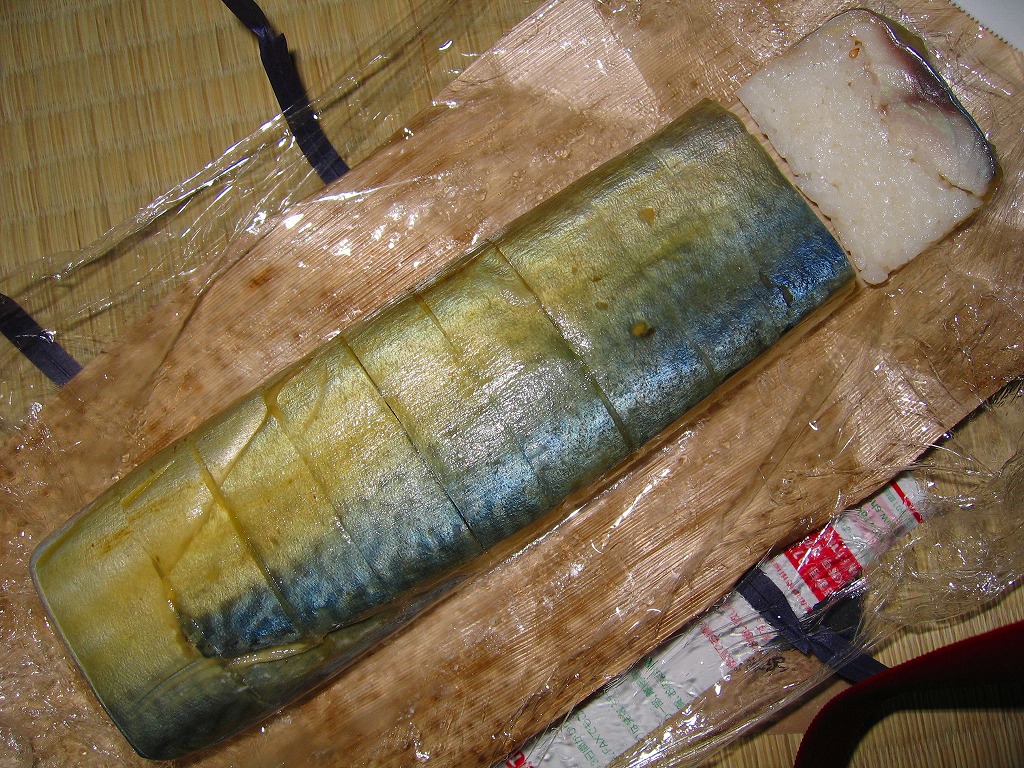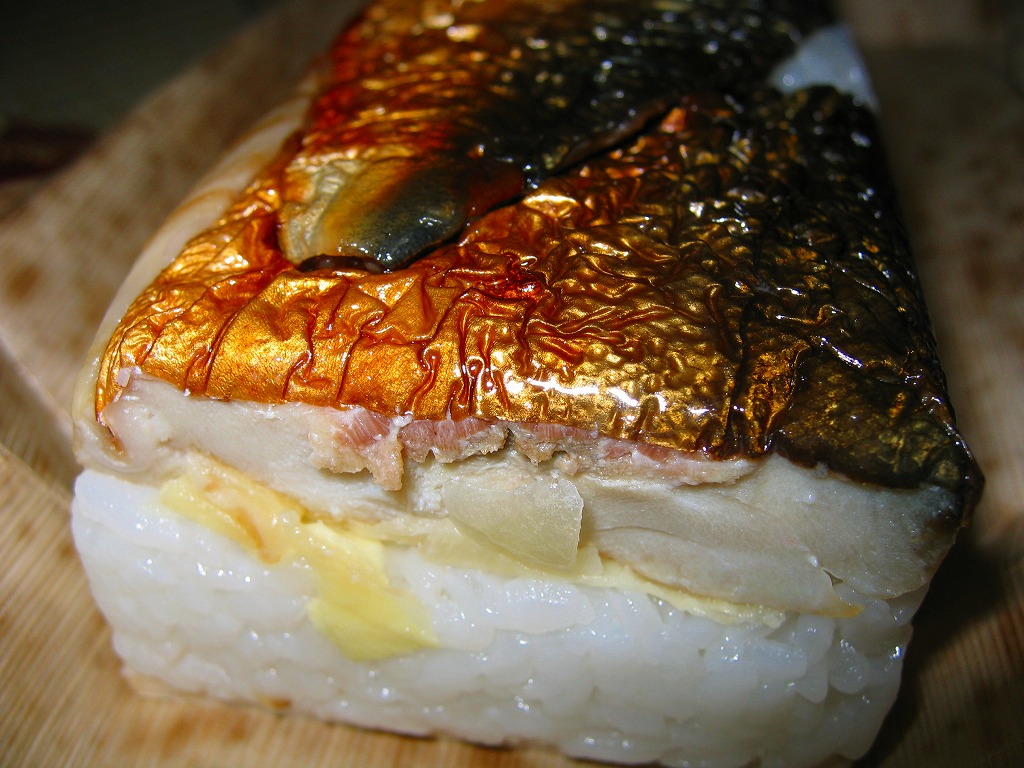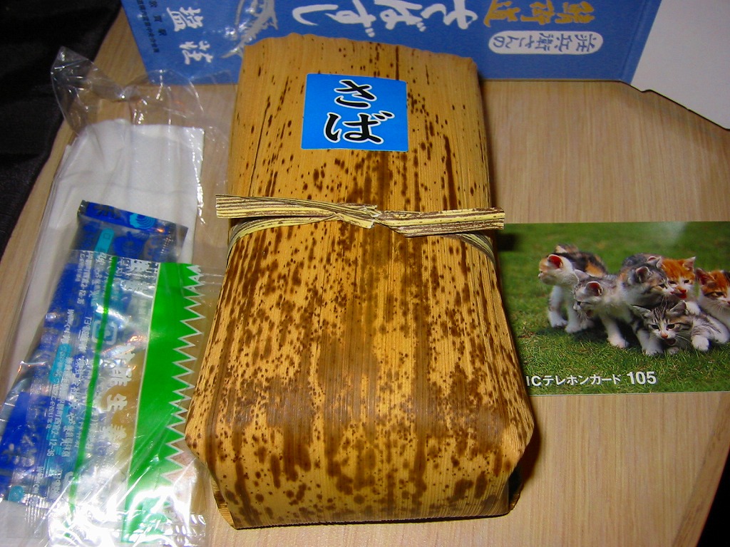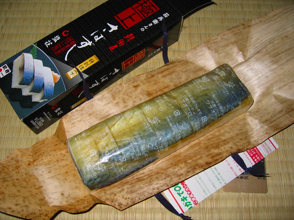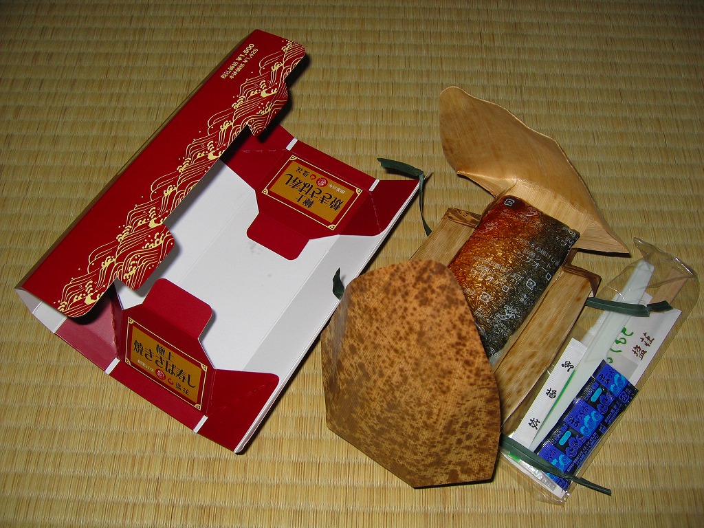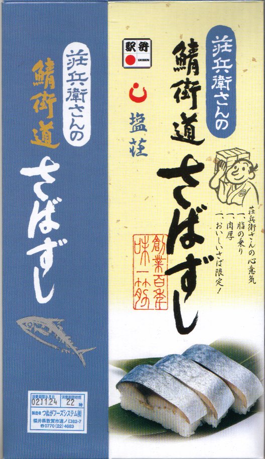 敦賀駅弁の主力商品。酢飯と肉厚で脂の乗った鯖を白板昆布で巻き、笹の葉で包んで針金で巻いて、ボール紙のパッケージに詰め込む。米子や高山の同種駅弁と同等の値段と美味を誇るが、通販注文用ハガキを同封している点が他と異なる。鯛・カニ・マスのバージョンもあり、これも通販で購入可能。価格は2002年の購入時で1,500円、2014年時点で1,550円、2020年時点で1,700円。