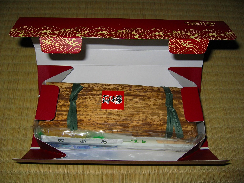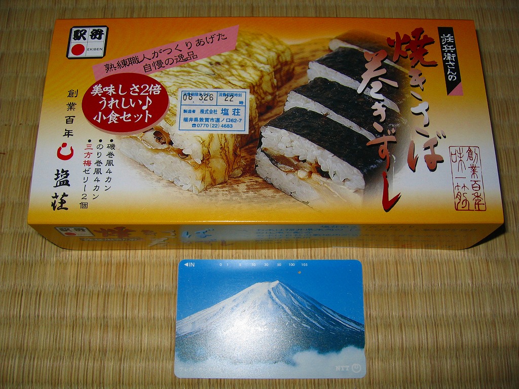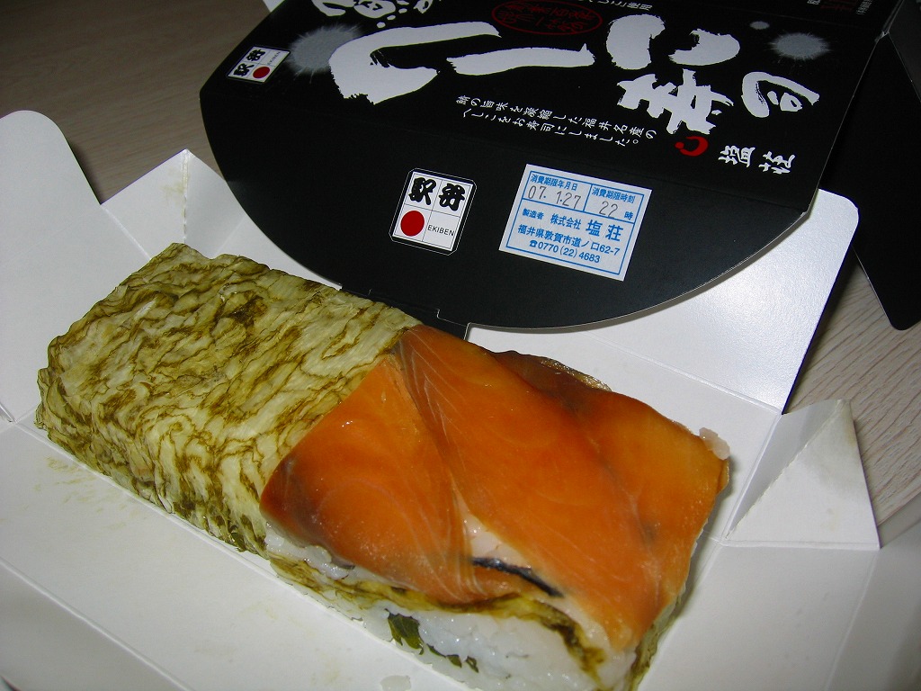 2006(平成18)年の発売か。敦賀駅の棒寿司駅弁でよく見る構造の、黒く小さなパッケージ。中身は棒状酢飯に生ハム色の薄く塩辛い身を貼り、その半分だけ昆布に巻くもの。通常のサバ棒寿司と異なり、とにかく魚の身がない一方で、これだけ分量が少ないのに千円で足りない値段がするので、おそらく不満が先行するだろう。1シーズンで売り止めた模様。