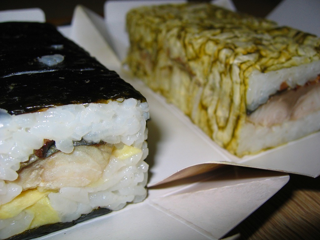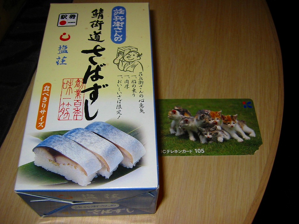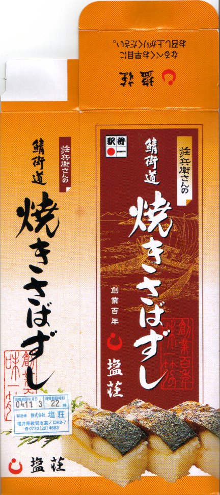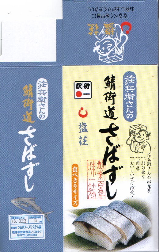 2005(平成17)年の夏か秋の発売と思われる、敦賀駅弁「荘兵衛さんの鯖街道焼きさばずし」の上等版。コンパクトなボール紙容器に見慣れた包装と形状の棒寿司が1本入る。中身は同じだが値段は倍なので、サバも良いものを使えるのだろう、焼き目の細やかさや身の厚さが、通常版より良いような気がした。価格は2006年の購入時で1,500円、2015年時点で1,550円、2020年時点で2,000円。