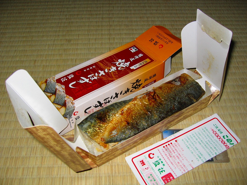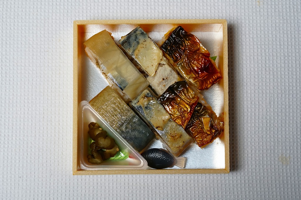 味は空弁や同種の駅弁と同等なものの、ナイフで切ると焼鯖の身が崩れてこぼれ落ちるので車内では食べにくく、ガリがえらく大量に挟み込まれていて、鯖の風味を邪魔する気がしないでもない。この駅では焼きではない鯖ずしのほうが美味いと思う。価格は2004年の購入時で800円、2019年時点で1,050円、2020年時点で1,080円。