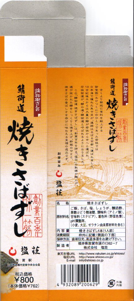 敦賀駅弁の主力商品「荘兵衛さんの鯖街道さばずし」の小型版。外観も中身も味もまったく同じで、長さが半分になり価格も約半分。小腹を埋めるか少食の方でもあの味が楽しめるというコンセプトか。公式サイトに掲載されていない商品。価格は2003年の購入時で800円、2014年時点で830円、2016年時点で850円。2019年頃までの販売か。