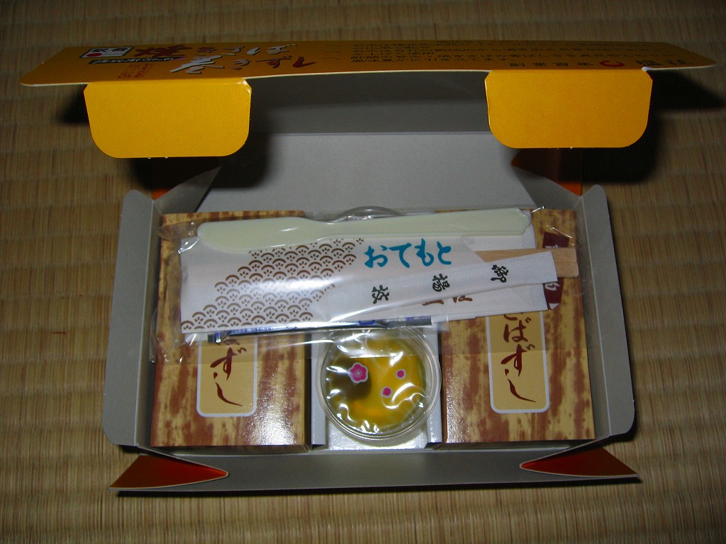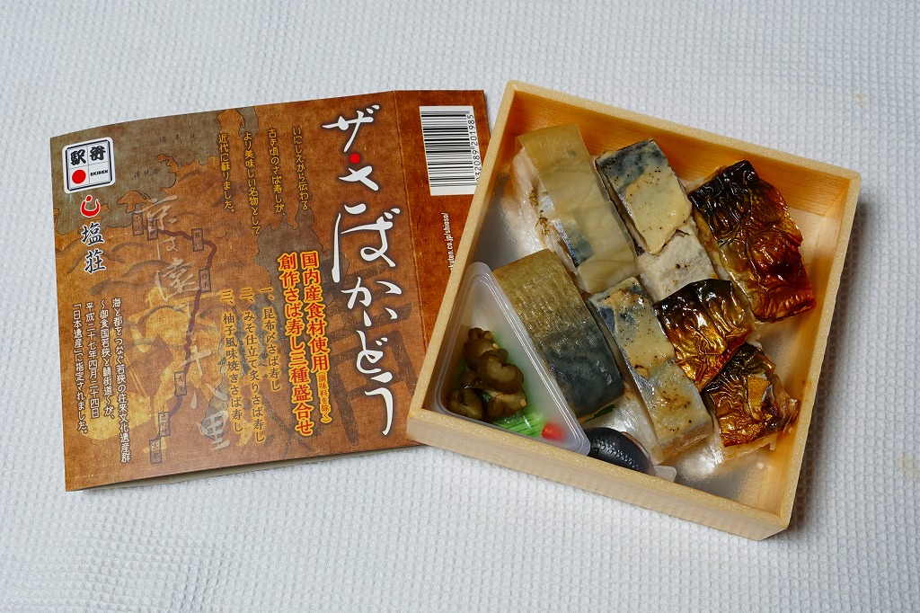 2015(平成27)年8月までに発売。小箱の中身はサバの棒寿司のカットが6切れ。その内容がスリーブに記載されているとおり、昆布〆さば寿しが2切れ、みそ仕立て炙りさば寿しが2切れ、柚子風味焼きさば寿しが2切れ。棒寿司の駅弁と同じ味を、食べやすく少しだけいただけるので、車内や旅先で食べる駅弁としては、こちらが重宝すると思う。2019年頃までの販売か。