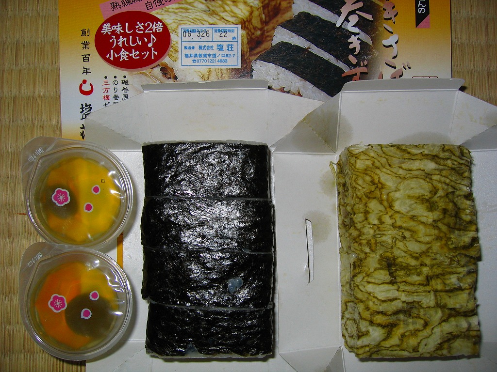 2004(平成16)年の末頃に発売か。中身の棒寿司の写真を載せた小さくきれいな紙箱の中に、のり巻焼きさばずしを収めた小箱と、磯巻焼きさばずしを収めた小箱と、うめゼリー2カップと、ナイフと割り箸と楊枝とお手ふきが入る。風味はいつもの敦賀駅弁だが、少量感が高いつくりなので、割高感が出ている。一方で分量や食べやすさを考えると、普通の棒寿司より駅弁としての用途に向いている。2006年頃までの販売か。