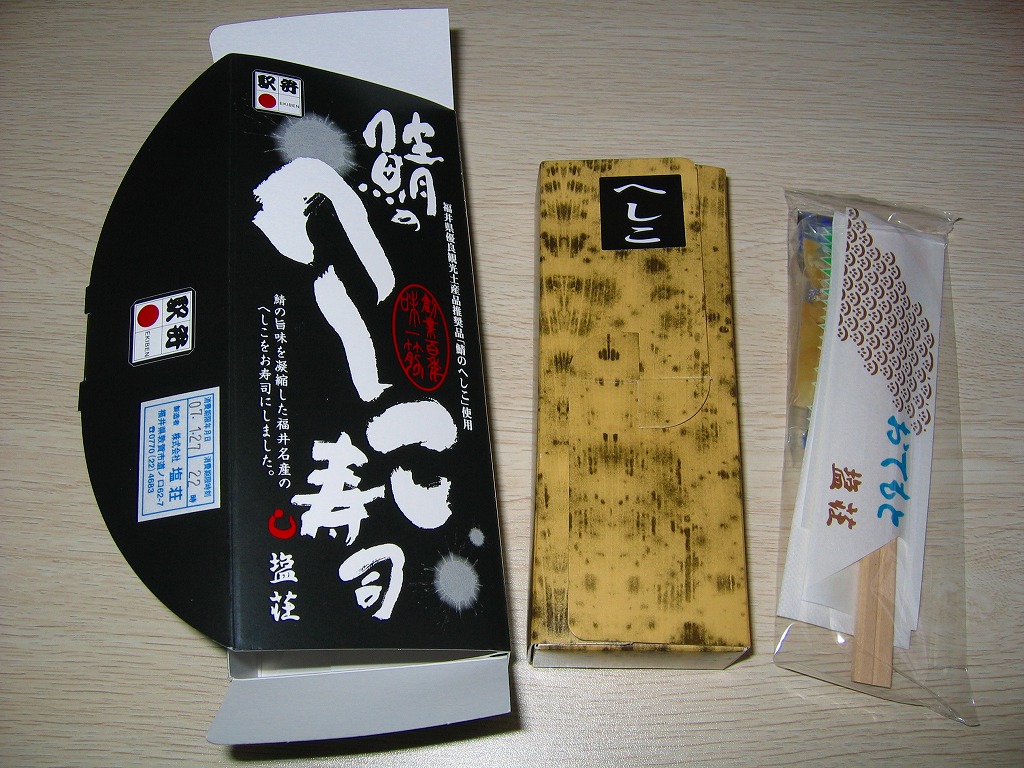 鯖のへしことは、サバを米ぬかに漬け込んだ福井の保存食。しかし保存技術の進歩で一年中プリプリのサバが食べられる時代となっては、これは酒のつまみにするために存在していると思う。寿司にして駅弁として売ることに意義は薄そうで、こうやって駅弁大会に出品されて名を広めることくらいか。
