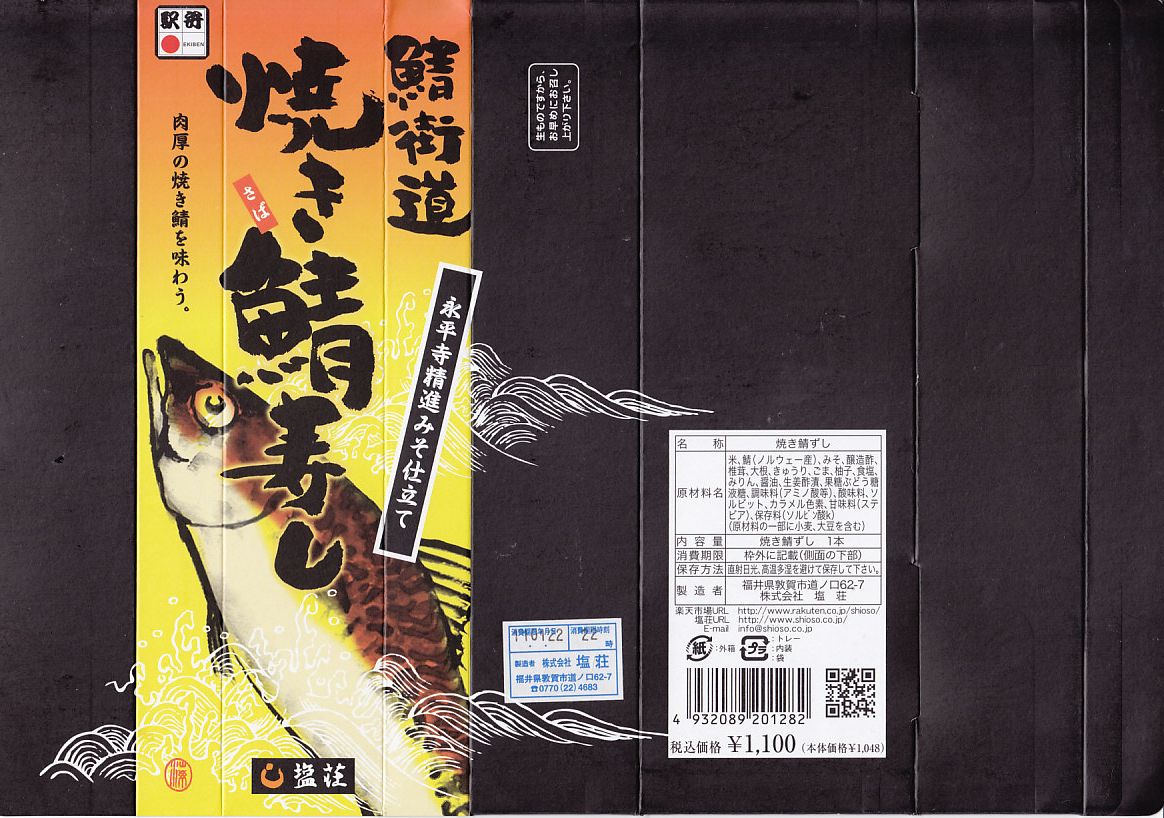 上記の駅弁「荘兵衛さんの鯖街道焼きさばずし」の、2011(平成23)年時点での姿か。内容と味は同じだが、竹皮は本物になり、駅弁の名前は短くなり、パッケージと中身が小さくなった感じで、しかし価格は300円も上がって1,100円。酢飯がノーカットで1本なのに、焼サバが6切れにカットされている不思議な合わせ方だった。2015年時点での価格は1,150円。2015年までの販売か。