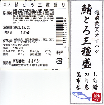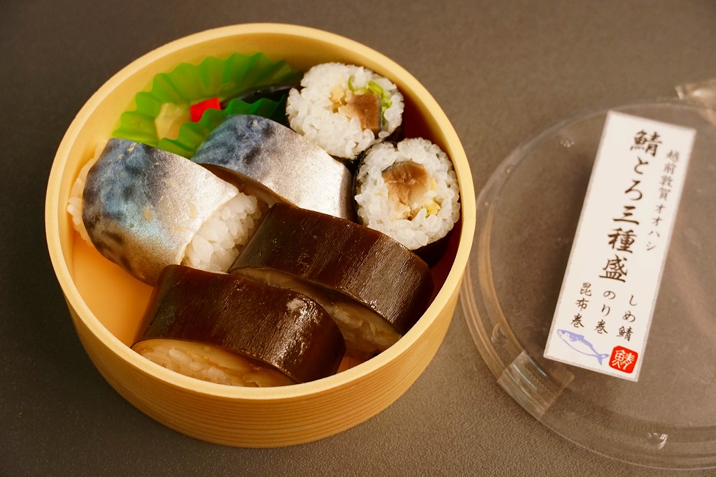 敦賀駅で買えた鯖寿司。敦賀駅の駅舎に見える交流施設「オルパーク」の1階で、駅と駅弁売店を結ぶ通路に、敦賀で1986年創業の水産物屋が屋台を出し、サバの箱入り棒寿司や米などを販売していた。丸い惣菜プラ容器に、しめ鯖と酢飯を合わせた鯖寿司を2切れ、さらに黒板昆布で巻いた鯖寿司を2切れ、しめ鯖の細巻きを2個詰めた。敦賀駅のコンビニにない味わいと、価格と内容で敦賀駅で普段売られる駅弁にない手軽さがある。この調製元の鯖とろ寿司は、脂がのって身の厚い三陸産の鯖を使用し、独自の製法で生よりおいしい鯖とろ寿司を実現したという。