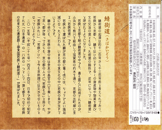 2003(平成15)年の末頃に発売か。有名な空弁「みち子がお届けする若狭の浜焼き鯖寿司」の影響を受けて商品化されたようで、調製元のネット通販サイトでは「今、空弁&駅弁で大大大ブレイク中」などと宣伝された。酢飯の上に焼鯖をたっぷり載せた棒寿司を、竹皮に模したボール紙で包み、フルカラー印刷のパッケージに包む。