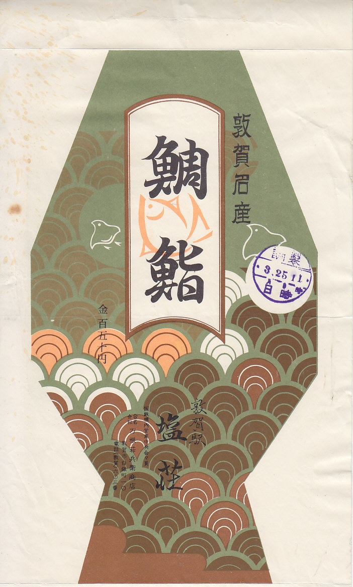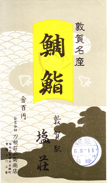 入手状況から1963(昭和38)年の、5月3日11時の調製と思われる、昔の敦賀駅弁の掛紙。敦賀駅で伝統の駅弁であり、「鯛鮨」「塩荘」と書かれるだけで締まりのある絵柄にみえる。