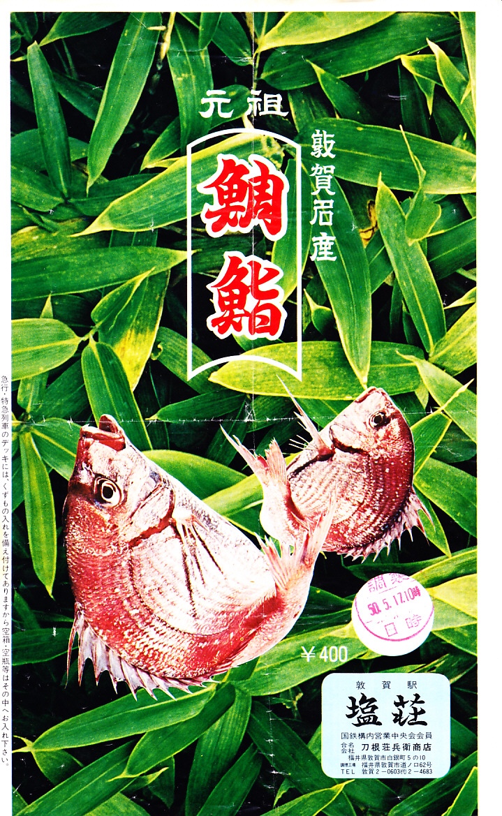 1975(昭和50)年5月17日10時の調製と思われる、昔の敦賀駅弁の掛紙。この笹に鯛のという絵柄の構成は、今のものと変わらない。