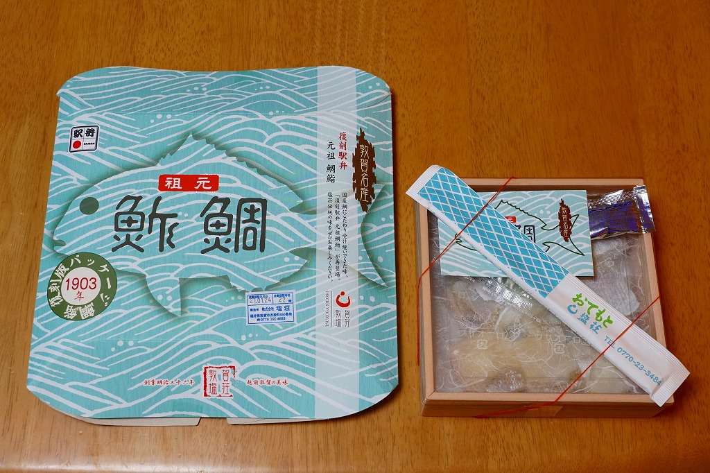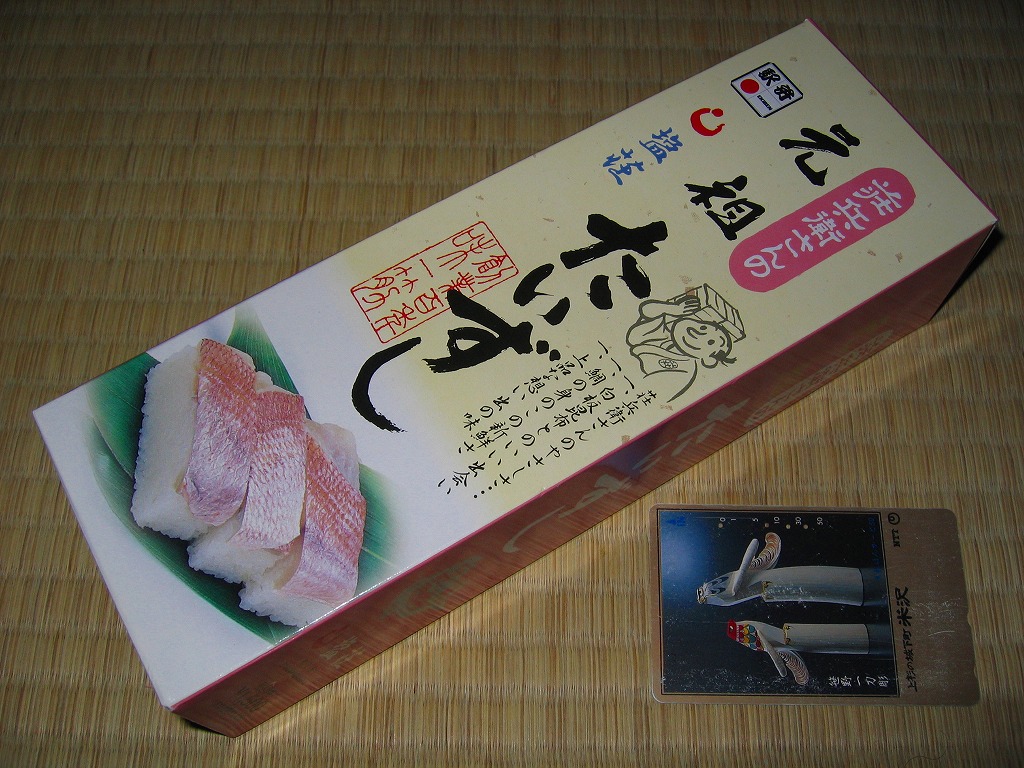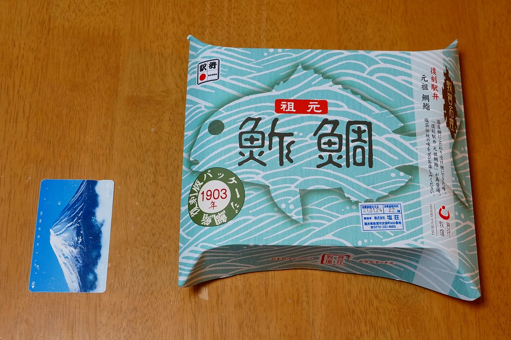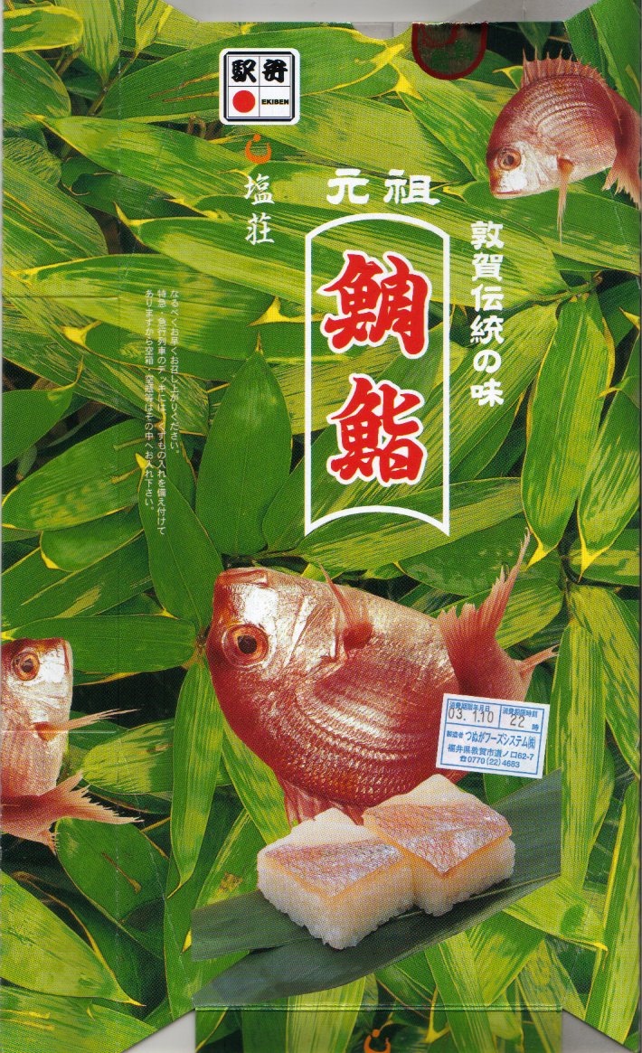 2003(平成15)年1月10日に購入した、敦賀駅弁の箱。当時は「元祖鯛鮨」の折箱を収める紙箱について、折箱の形に合わせ、四隅の角が落とされていた。この形状は昭和時代からのものであった。