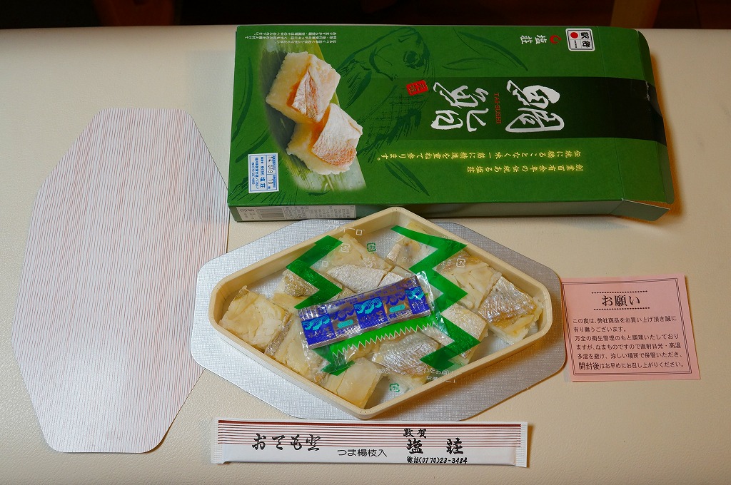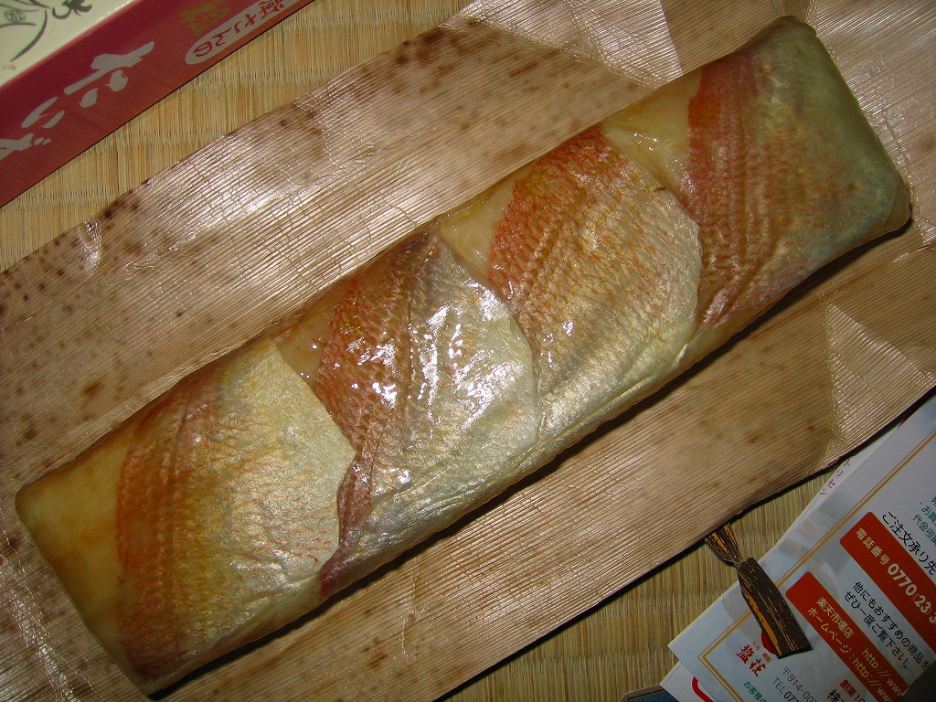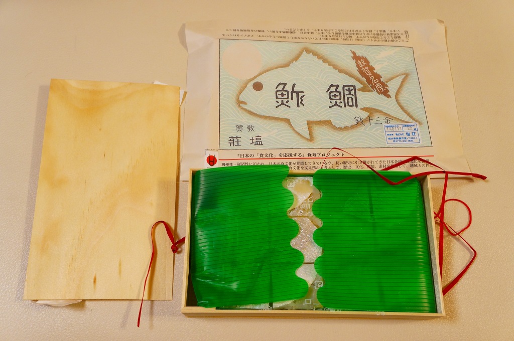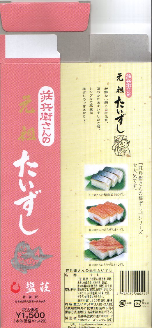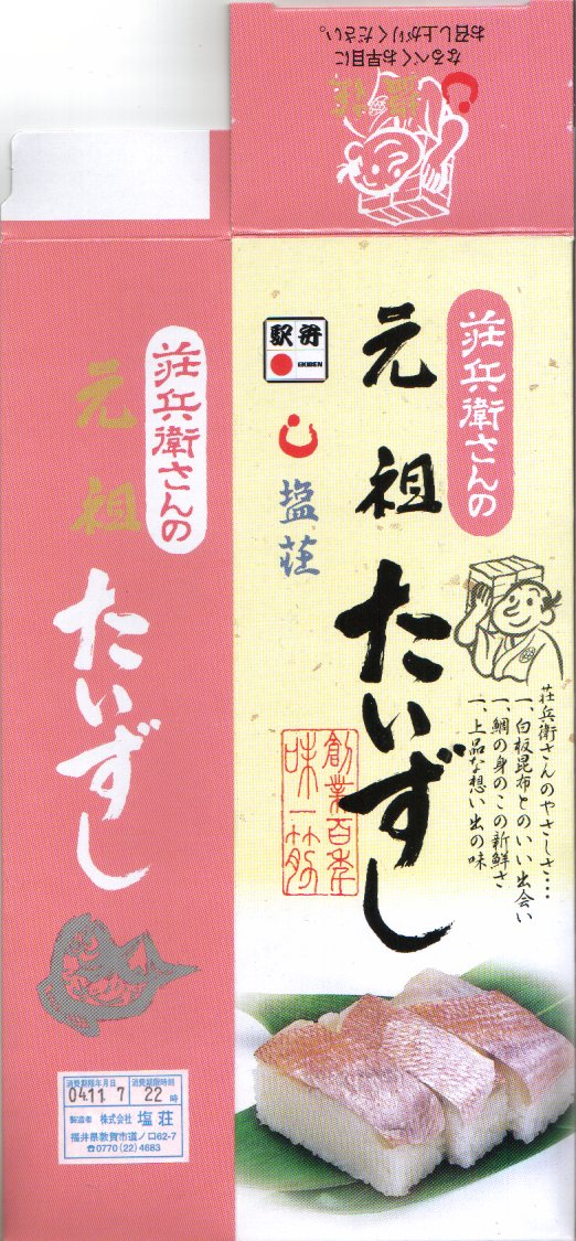 敦賀駅弁の主力商品「荘兵衛さんの鯖街道さばずし」の、サバがタイに変わったもの。酢飯の上に鯛の身を敷いて、抗菌シートとともにラップで巻いてから笹の葉で包み、針金で止めて化粧箱に入れる。うまみも強いがクセも強いので、万人受けはしないと思う、高品質で高価格な土産物系棒寿司駅弁。通信販売対応商品。価格は2004年の購入時で1,500円、2014年4月の消費税率改定で1,550円、2020年時点で1,700円、2023年時点で1,800円。