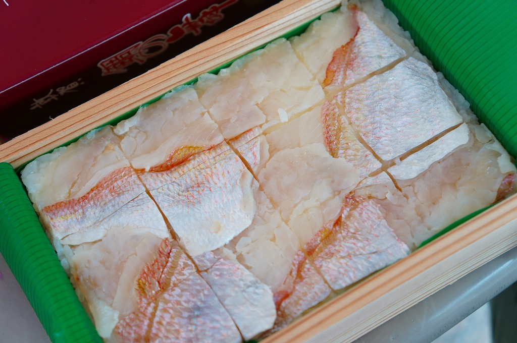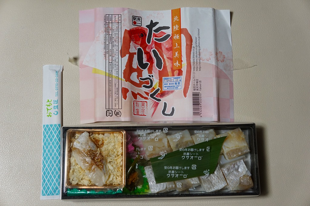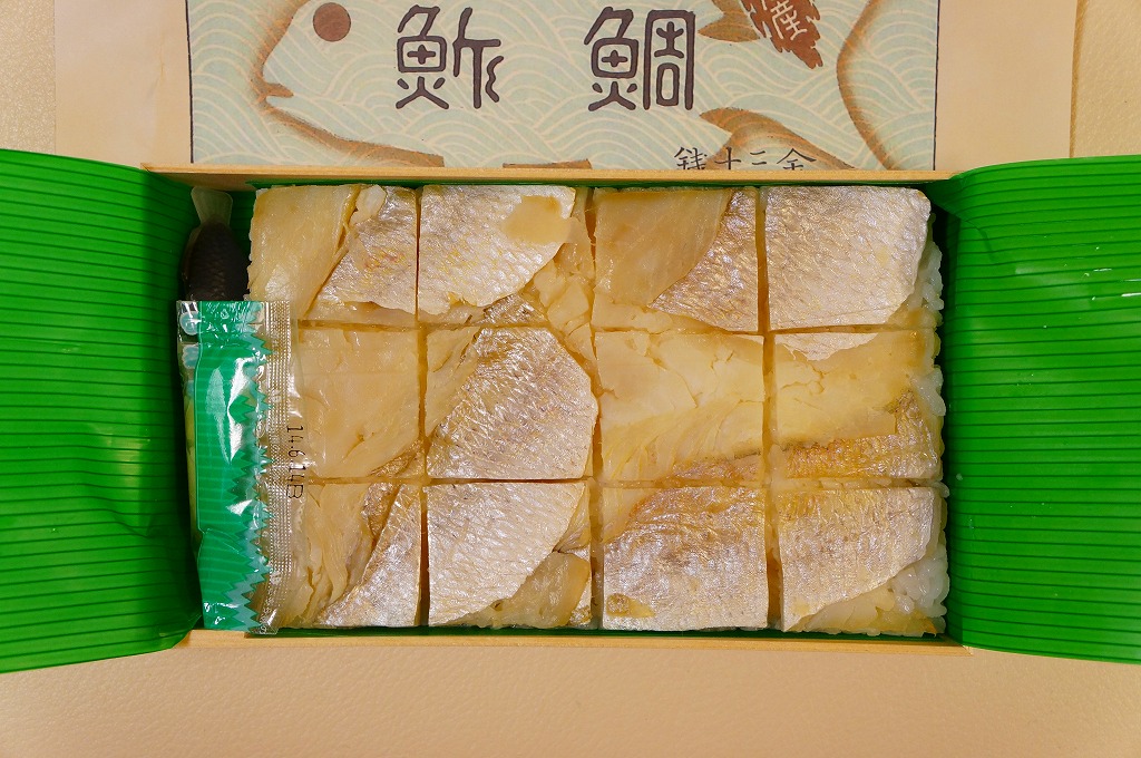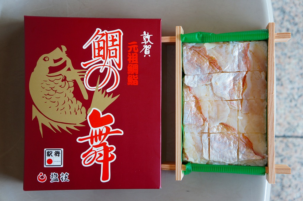 2016(平成28)年9月に「ますづくし」とともに、北陸自動車道や名神高速道路のサービスエリアで発売。12月頃から東京駅や駅弁催事に顔を出すようになった模様。中身はタイ押寿司とタイ飯のセット。立方体の押寿司はプラ製の仕切りトレーにより見栄え良く整列し、タイのフレークと切り身を乗せた御飯も正方形トレー内で美しく、アサリとコンブの和え物とワカメの酢の物を添付。味はいずれも淡く控えめで、少々の高級感を備えていた。2018年頃までの販売か。