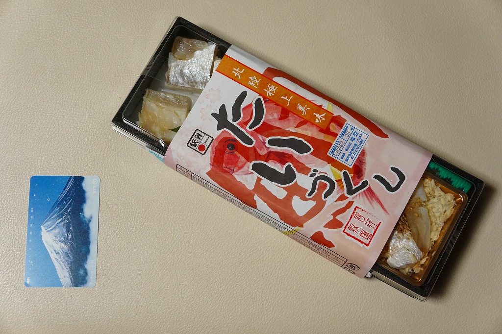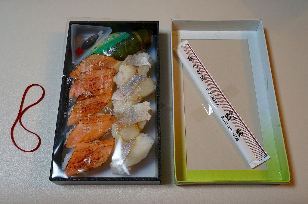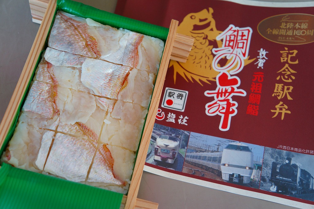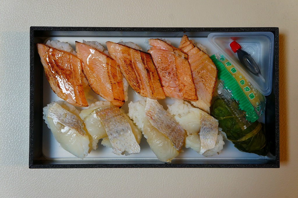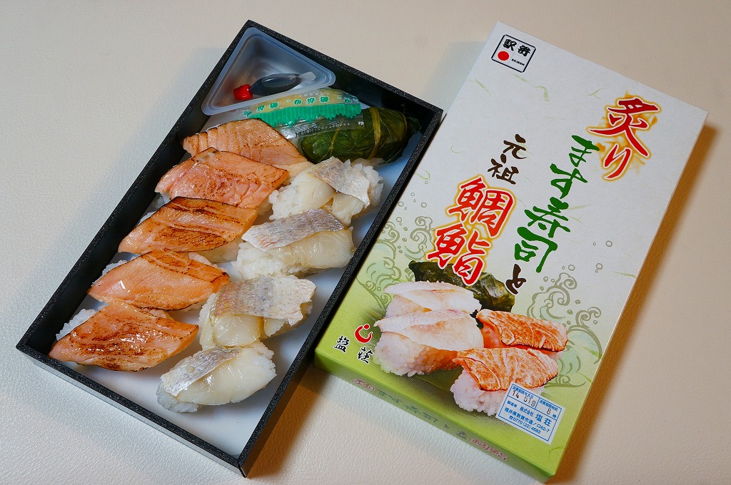 2013(平成15)年の秋までに発売か。その名のとおり、炙ったマス(サーモン)寿しを5個、敦賀駅弁の元祖鯛鮨を4個、加えて高菜巻を1個、プラ製トレーのくぼみにはめて、ガリと醤油を加え、名前と中身の写真を印刷したボール紙の箱に詰める。詰め方は味気ないが、味は確か。伝統の元祖鯛鮨に、トロトロで脂の乗る炙りマスに、モチモチ感を詰め高菜巻。価格は2014年の購入時で1,030円、2019年時点で1,100円、2020年時点で1,180円、2023年時点で1,280円。