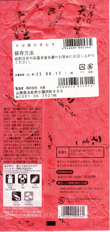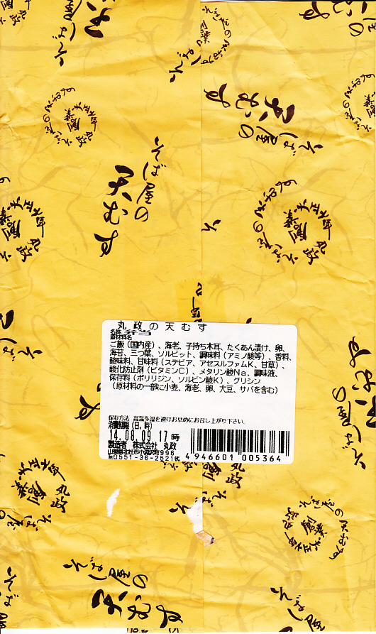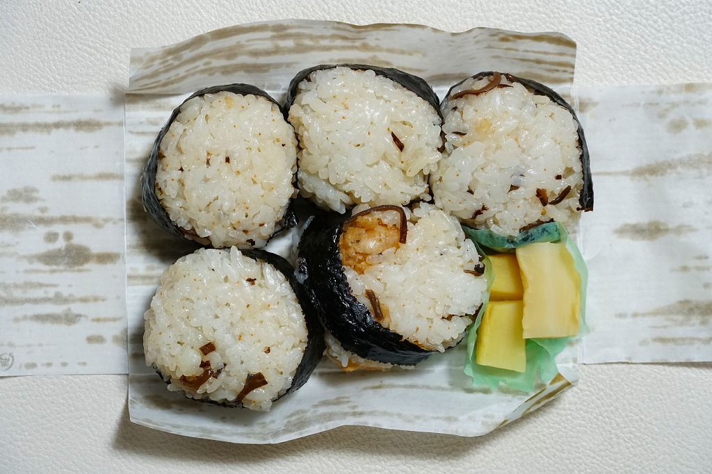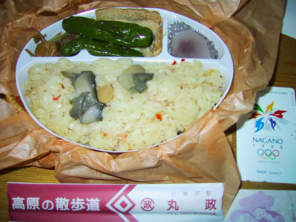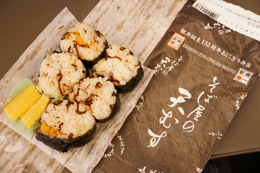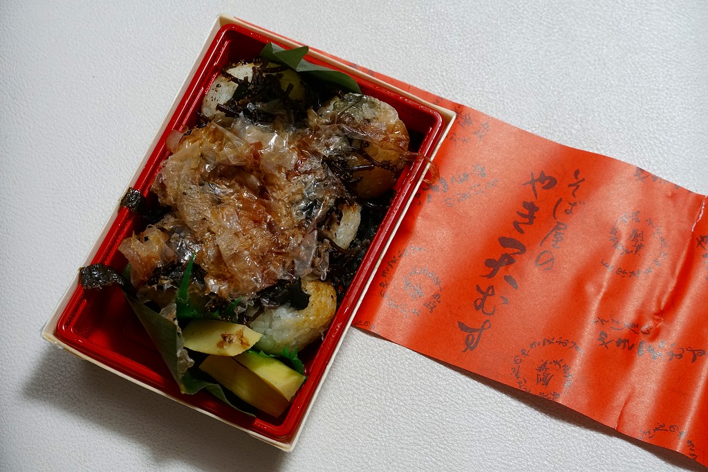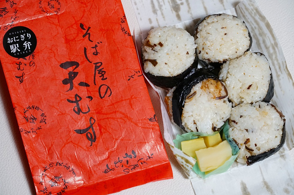 2013(平成25)年12月の発売。キクラゲの混ぜ御飯で小さなエビ天を巻く、ピンポン球くらいの大きさのミニおむすび5個とタクアンを、竹皮に包んで、紙袋に詰める。調製元は小淵沢駅の駅弁屋であるが、同時に駅そば屋や立ち食いそば屋でもあるため、この商品名で合っている。