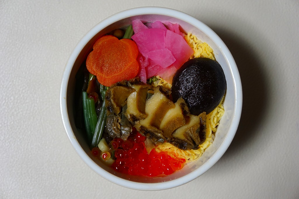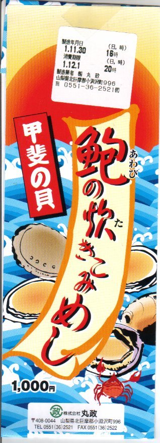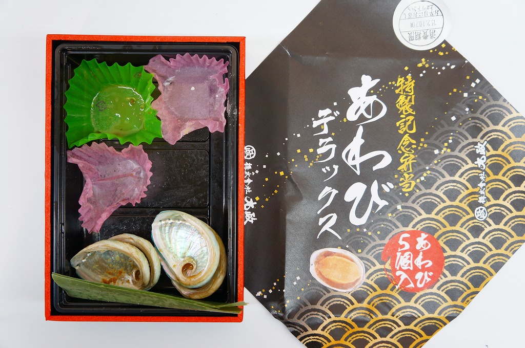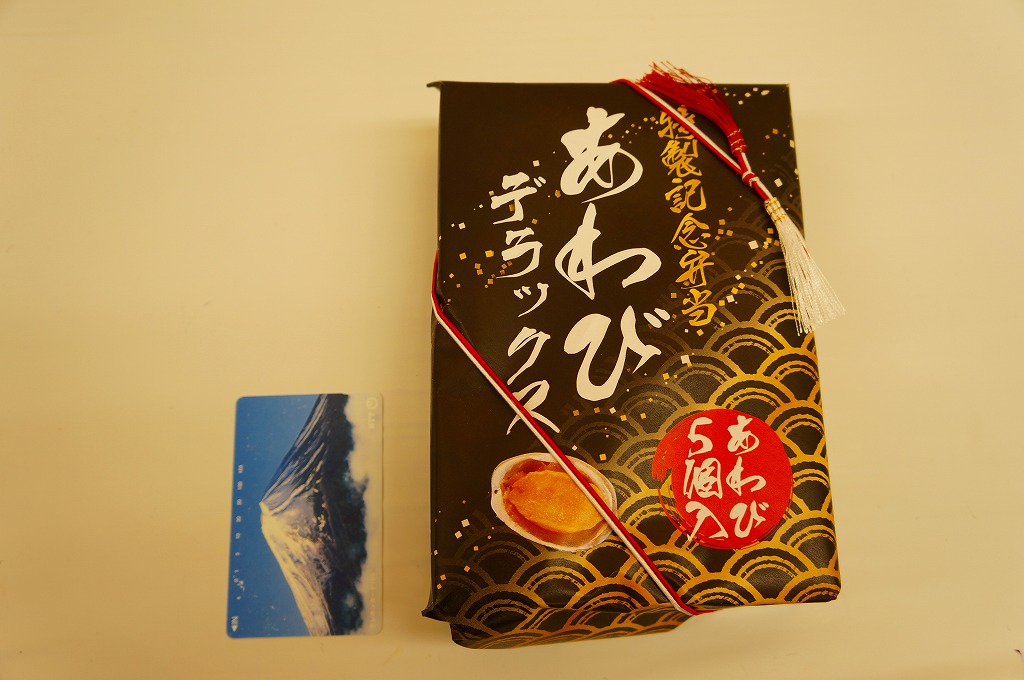 2013(平成25)年2月の鶴屋百貨店の駅弁大会で、いくつかの小淵沢駅弁とともに実演販売されたお弁当。長方形の容器に茶飯を敷き、小粒ながらきれいなアワビを5個も敷き列べ、煮物や大福などを添えるもの。なぜここでこういう商品を作ったのかはよく分からないが、第50回記念の駅弁大会のチラシと催事場に花を添えた。
