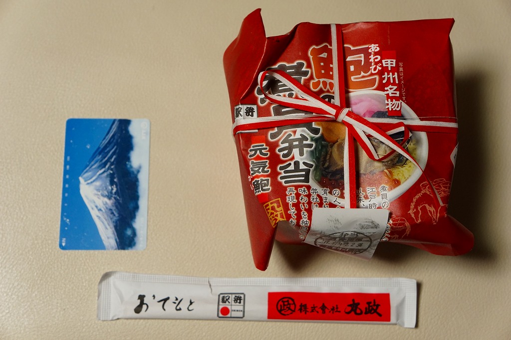 陳列に難がありそうな貝の形に編んだ竹籠の容器を使用、白いトレーを収めて、その中でアワビときのこの炊き込み御飯の上にアワビのスライス煮が載り、鶏肉・エリンギ・山くらげなどを添える。この価格の割に少量であるうえ、アワビが主に身ではなく出汁として入るため、「高原野菜とカツの弁当」か「元気甲斐」に手が伸びる。「甲斐の貝」は駄洒落ではなく、アワビの煮貝は四百年の伝統を持つ山梨県の名産品。価格は2001年の購入時で1,000円。その後しばらく見なかったが、2013年頃に1,300円で再登場した模様。価格は2017年時点で1,400円。2017年までの販売か。