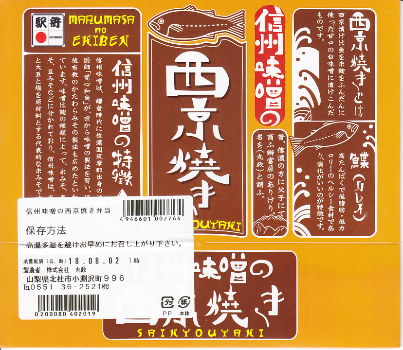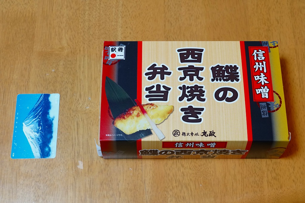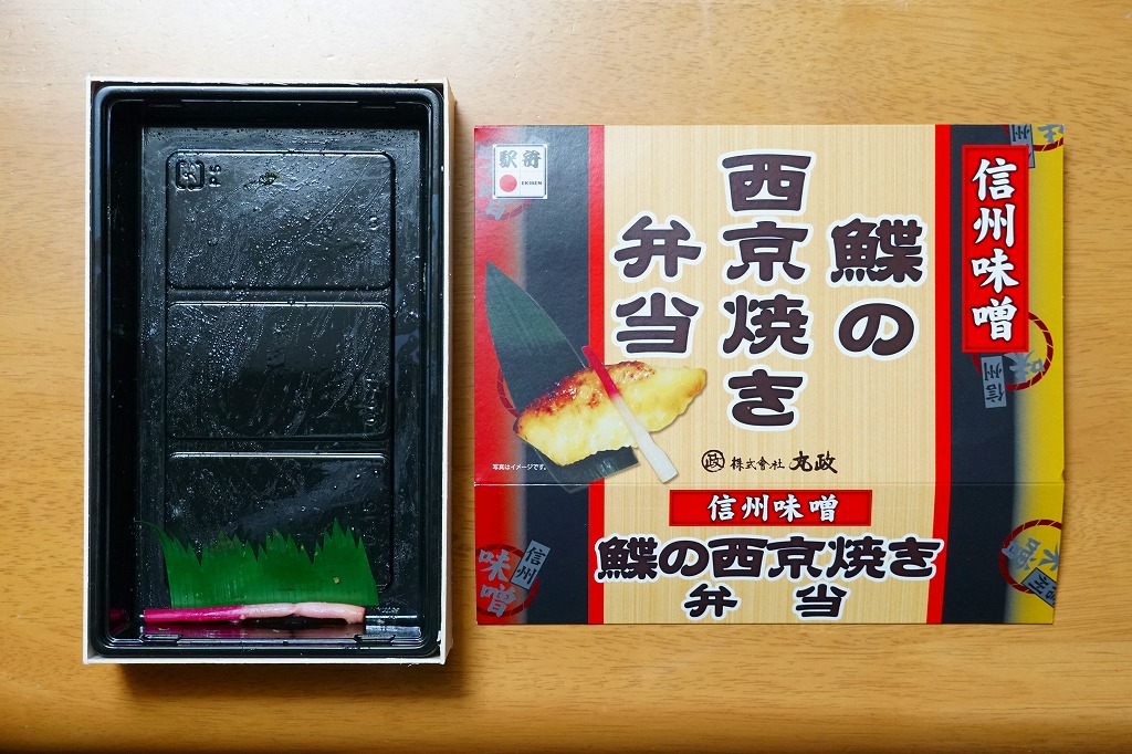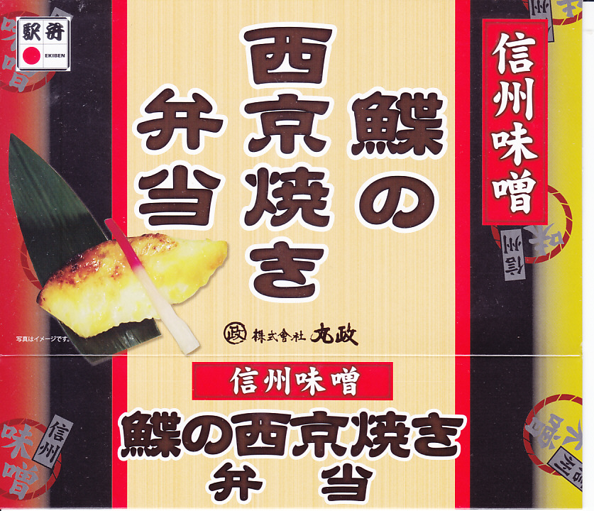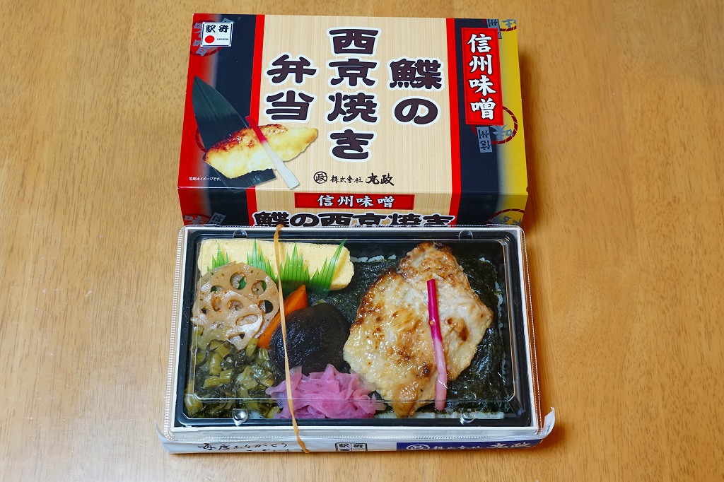 2018(平成30)年の夏に「信州味噌の西京焼き」の名前で発売か。2020年までにスリーブの絵柄を一新、容器や中身や値段を変えずに、名前が「信州味噌鰈(かれい)の西京焼き弁当」に変わった。中身は茶飯の半分を海苔とカレイ西京焼で覆い、残る半分を玉子焼、玉子焼、高菜、レンコンのきんぴら、ニンジンとシイタケの煮物、大根桜漬で覆う。味噌味の強さを感じさせない、あっさりとした白身魚。魚の小淵沢駅弁は、エンガワでないカレイの駅弁は、珍しいと思った。2024年までの販売か。