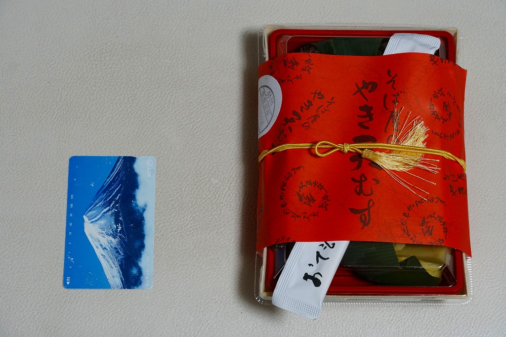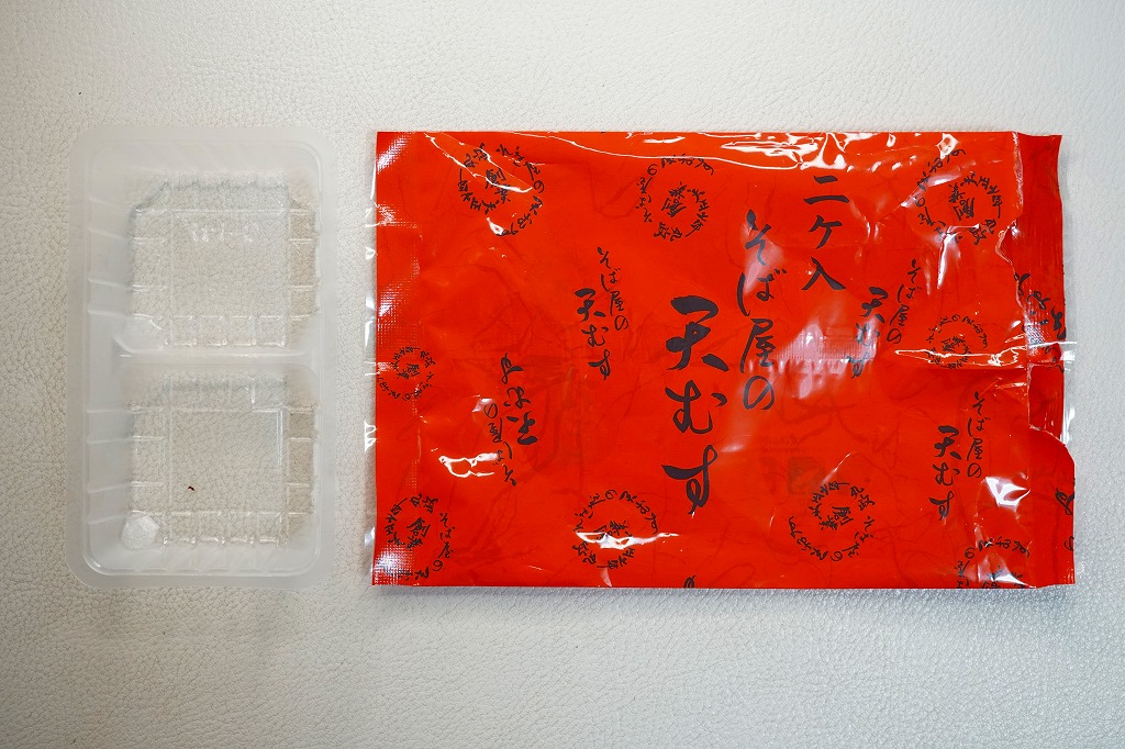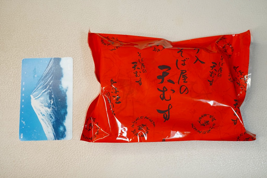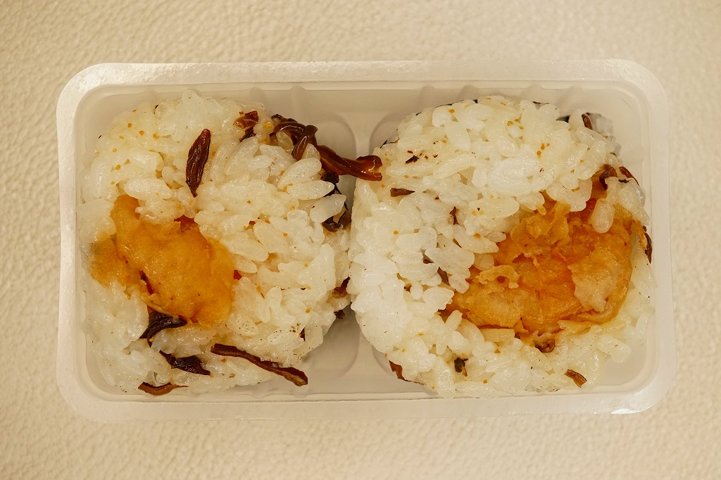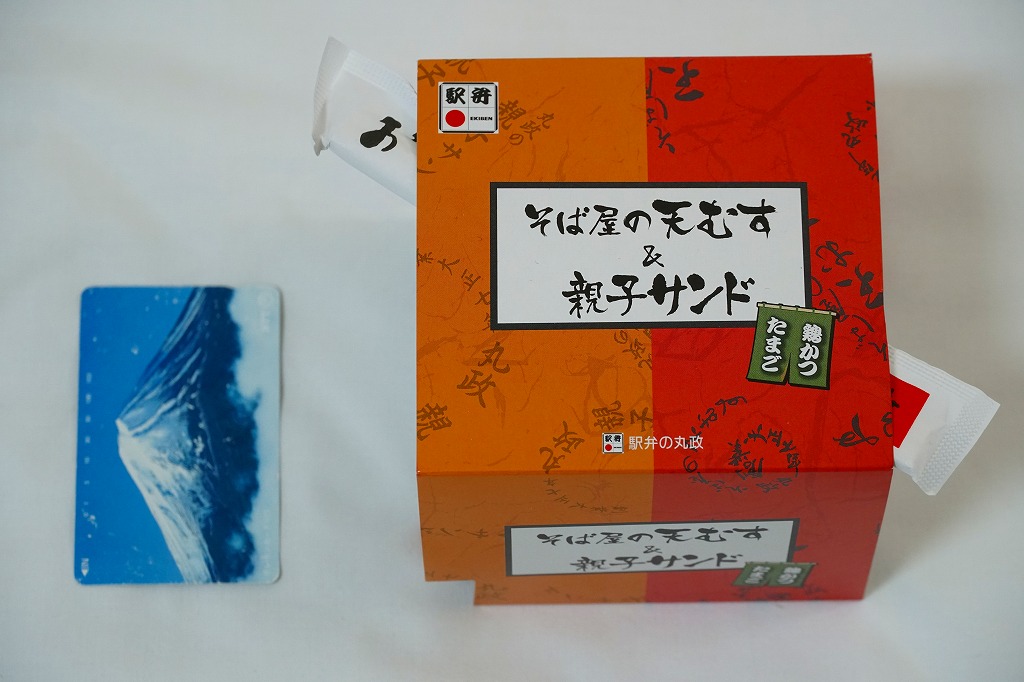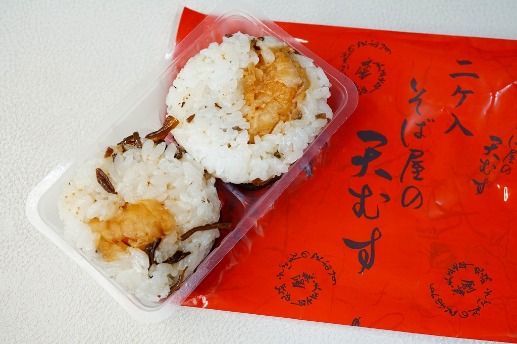 2023(令和5)年4月に東京駅で発見。小淵沢駅の駅弁「そば屋の天むす」の2個入り版。赤い絵柄はそのままに、プラ製になった小袋に、丸い天むすを2個、透明なプラ製トレーに収めて詰める。中身は5個入りと同じでも、中身が潰れないので、味が整うように思える。価格は2023年の発見時で360円、2024年時点で380円、2025年時点で400円。