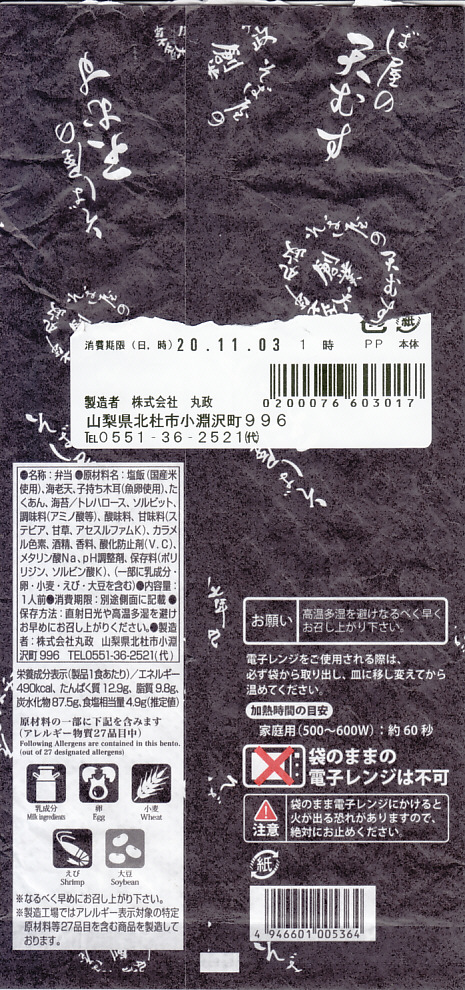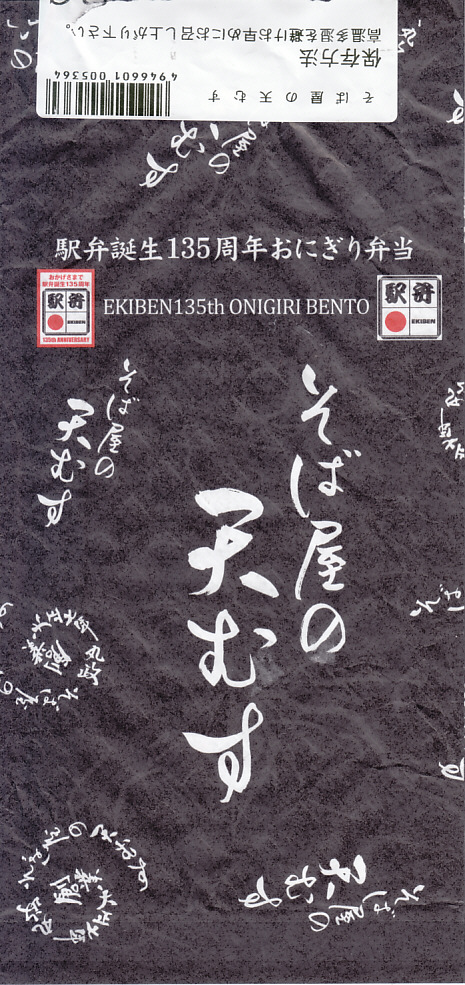 2020(令和2)年11月2日に購入した、小淵沢駅弁の袋。中身や風味や値段は、普段の小淵沢駅弁「そば屋の天むす」と同じで、下記や上記のものと同じ。2020(令和2)年4月からは「駅弁誕生135周年おにぎり弁当」の副題を付けて、黒い袋で売り出した。東京駅では一年間くらい、この袋だった模様。催事や現地では、普段の朱色の袋を使ったとみられる。