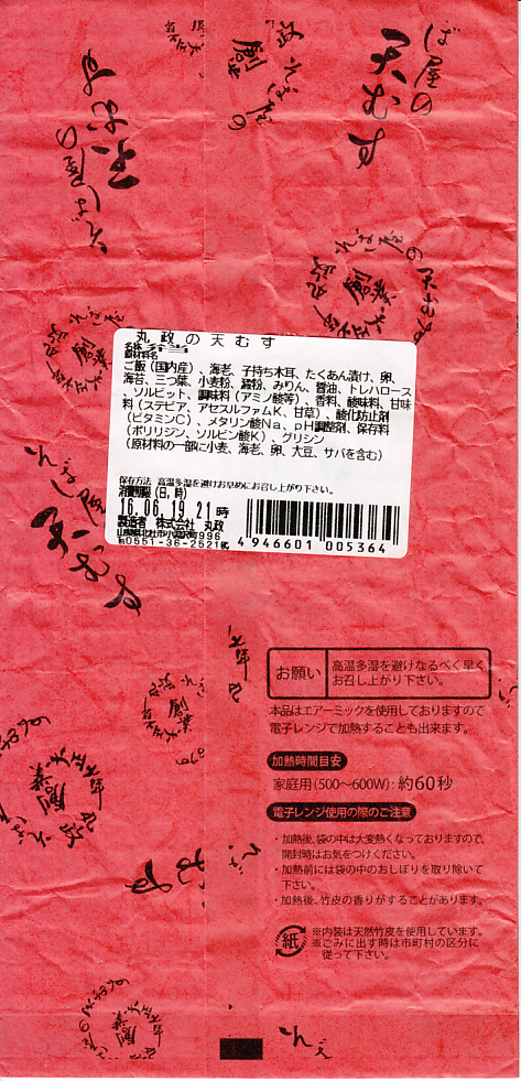 駅売りの天むすは、名古屋のものに一日の長があり、そちらはエビ天が顔を出していて見栄えがする。こちらは味とつくりで名を広め、今は東京駅の人気商品だったり、駅弁催事に出てきたりする。袋の色はこの朱色を基本に、催事版や記念版では黒くなることがあるが、中身や味が変わるものではない。価格は2022年4月の購入時で750円、6月から780円、2024年時点で850円、2025年時点で880円。