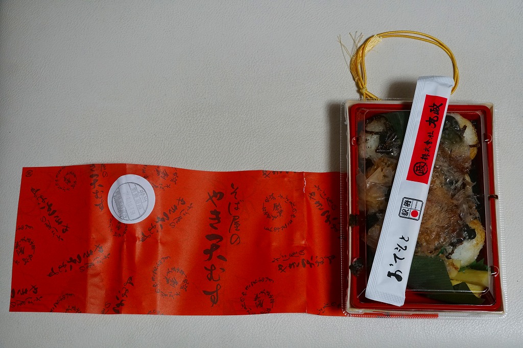 2022(令和4)年1月の京王百貨店と阪神百貨店の駅弁大会で実演販売。下記の人気商品「そば屋の天むす」の袋に「やき」を加えた絵柄の掛紙を使う。容器に笹の葉を敷き、海老天を詰めた球形の焼きおにぎりを6個詰め、子持ちきくらげとかつおぶしで覆い、漬物を添える。まるでたこ焼きを食べるように天むすをいただく背徳感。ファストフードかジャンクフードな駅弁の新顔として面白い存在だと思う。2023年1月の京王百貨店の駅弁大会でも販売。デパートの駅弁大会の実演販売でのみ販売か。