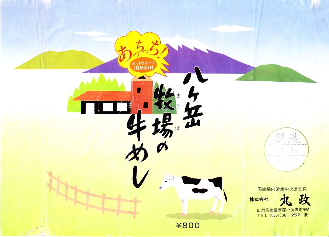 入手状況から1985年頃の調製と思われる、昔の小淵沢駅弁の掛紙。加熱機能付き容器を使う牛肉駅弁だったのだろう。当時の小淵沢駅には「うなぎ弁当」「牧場の牛めし」「煮かつ重」で3種類の温まる駅弁があった。
