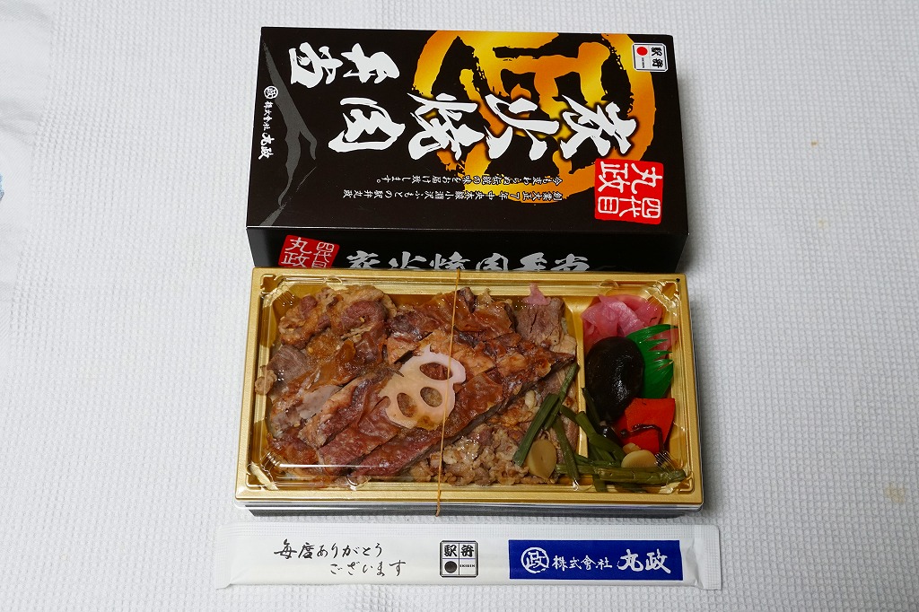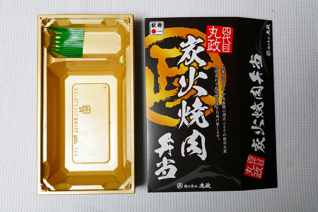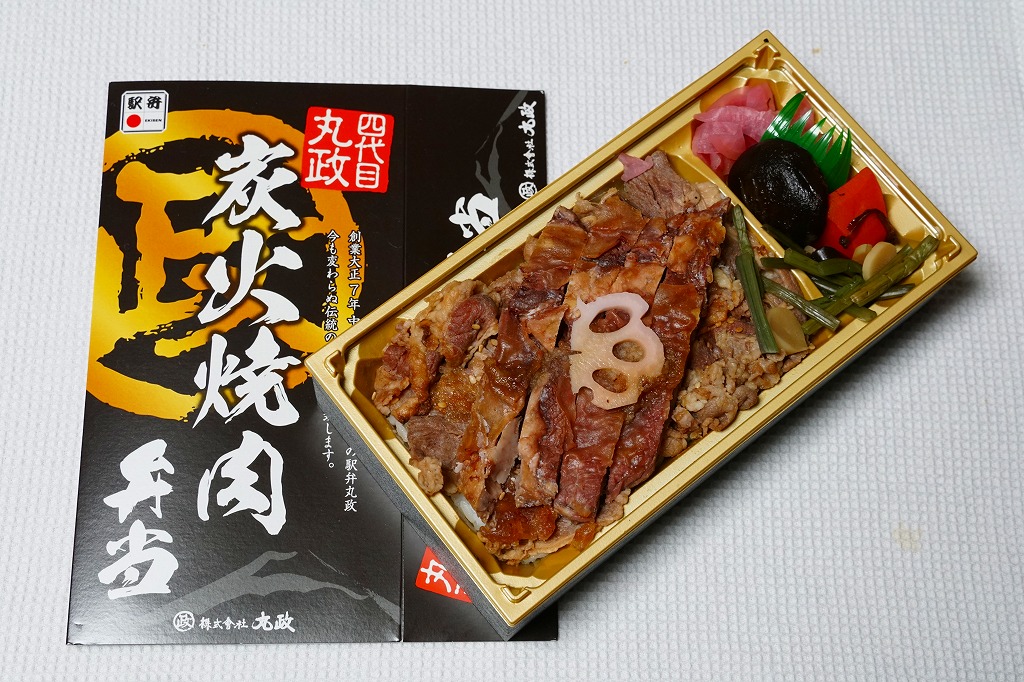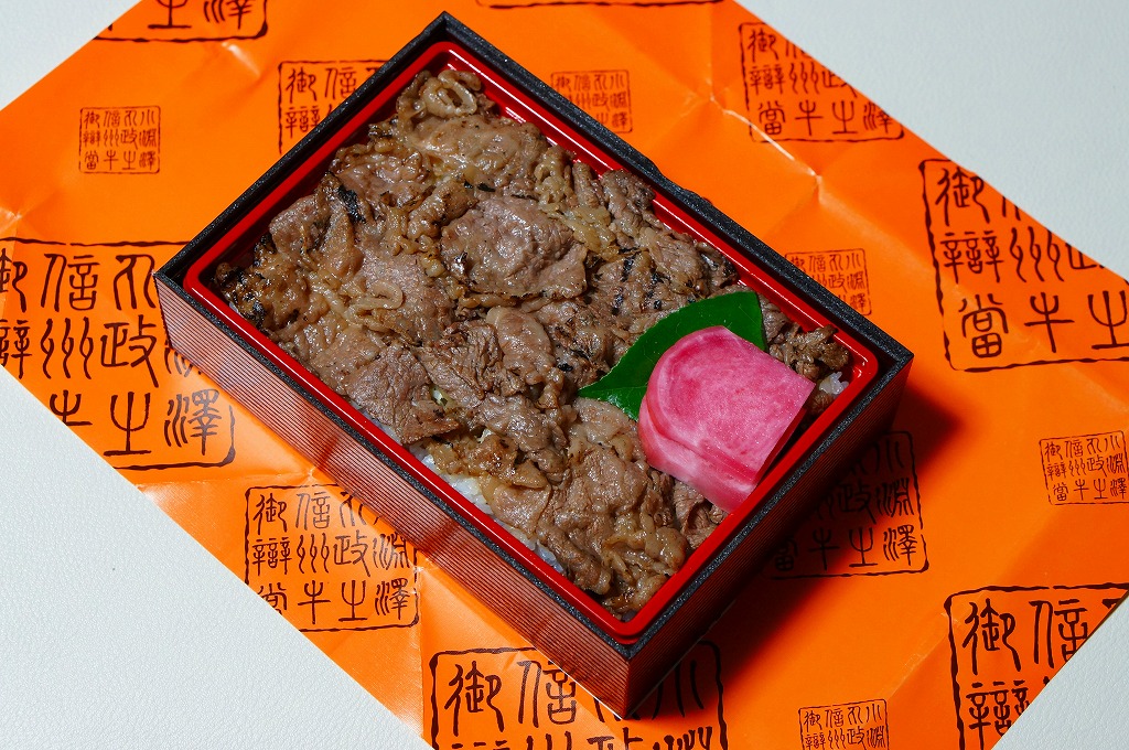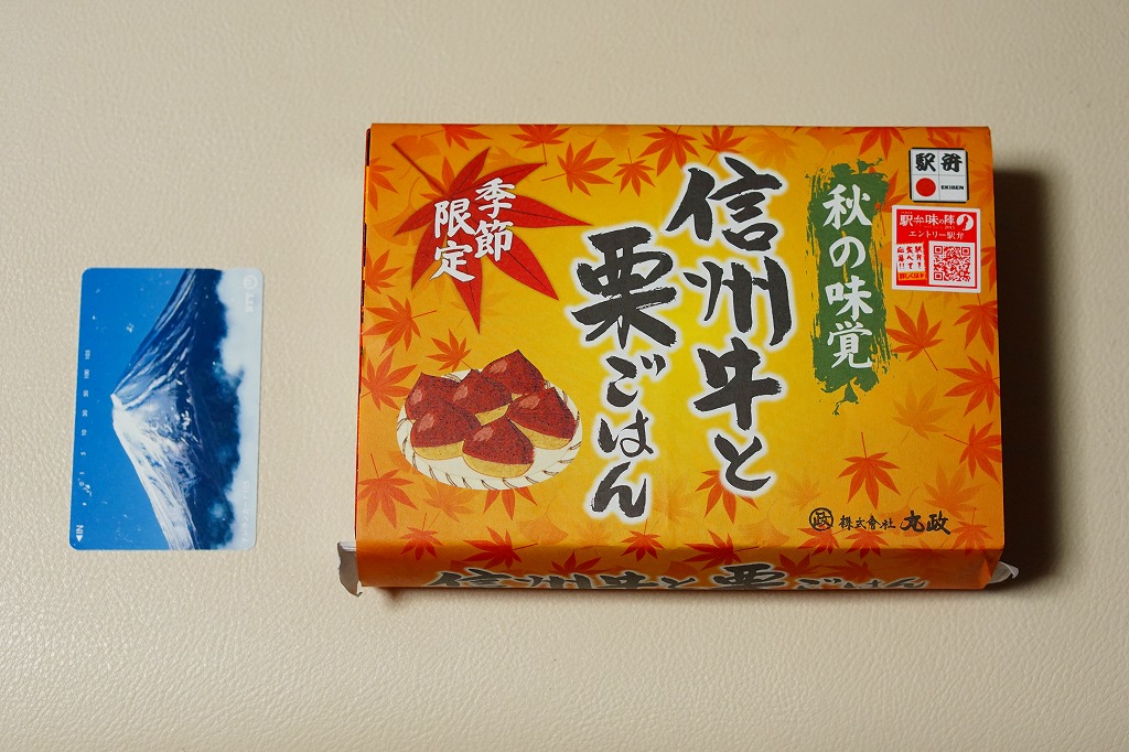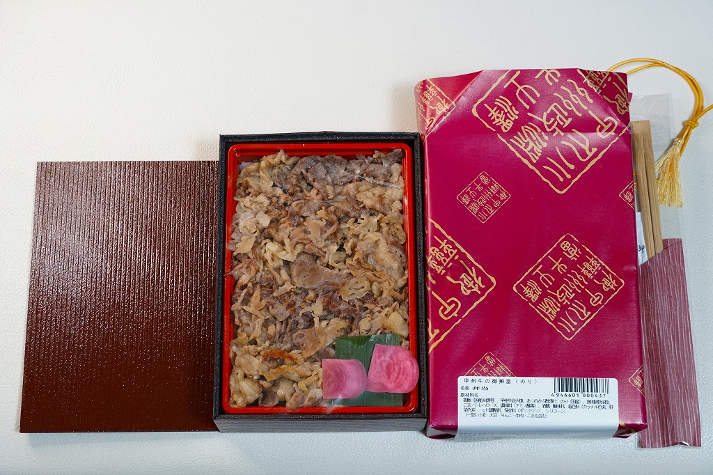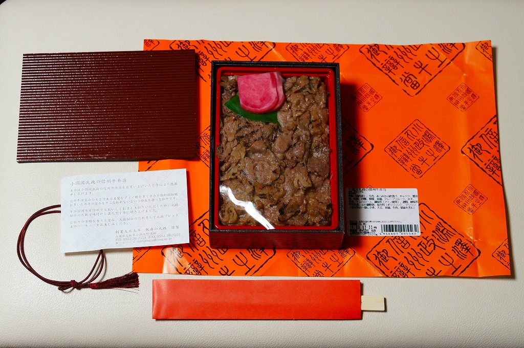 2014(平成26)年7月の発売。商品名は「小淵沢丸政の信州牛弁当」とも。木製風の折箱が、まるで贈答品のように包装紙でていねいに包まれる。中身は白御飯を牛焼肉で覆い、赤かぶ漬を添えるもの。長野県内や県外の生産者と加工業者と販売業者100者以上で構成する、信州牛生産販売協会のブランド牛「りんごで育った信州牛」の、枝肉格付け等級でA5とA4の肉を使用し、「完成まで七年かけた秘伝タレで丁寧に直火焼きで焼き上げ」たという牛肉は、脂身と赤身と焦げの香りと、肉の適度な柔らかさが印象的。東京駅で米沢駅弁に負けていない。価格は2014年の発売時で1,730円、2017年時点で1,980円。