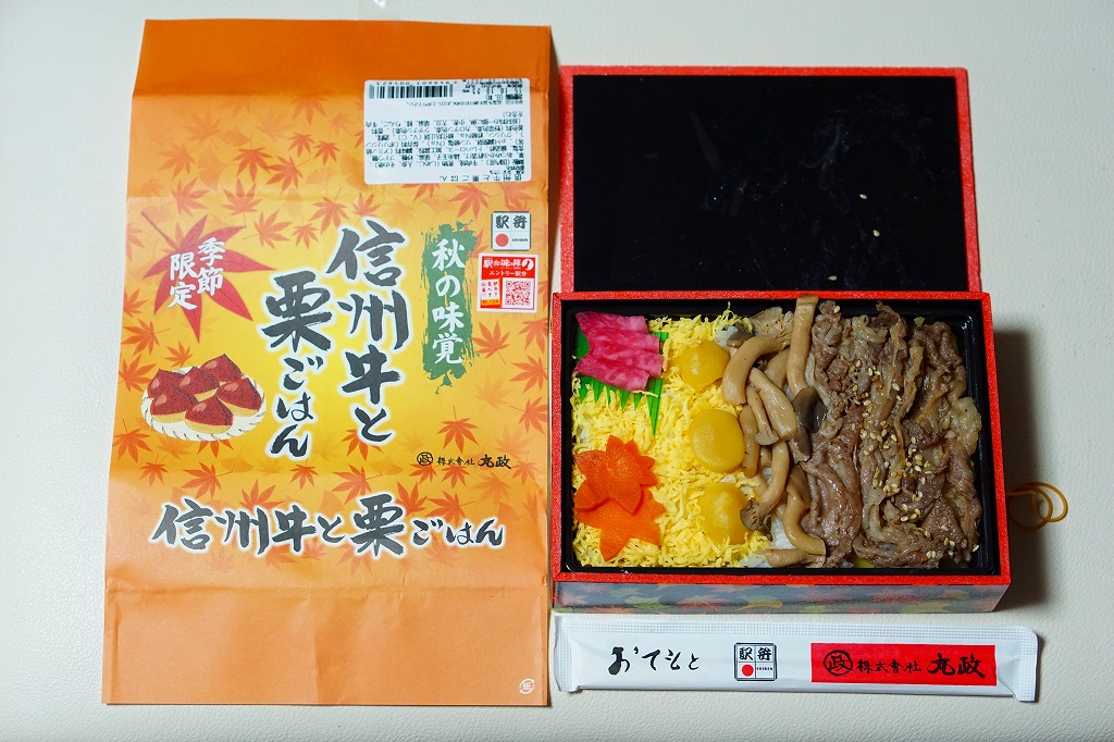 秋冬の駅弁大会シーズンに向けた、2014(平成26)年秋の新商品か。小淵沢駅や茅野駅の秋駅弁か。容器いっぱいに白御飯を敷き、錦糸卵と牛焼肉で半分弱ずつ、シメジとクリで残りを分けて覆い、カブ酢漬けとモミジ型のニンジン煮を添える。名前どおりの牛と栗。栗の甘味と牛肉の焼き肉感が、それほど多くない分量の割にしっかりと出ていた。2018年頃までの販売か。