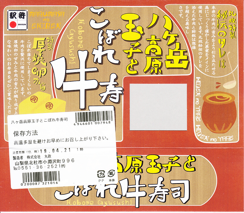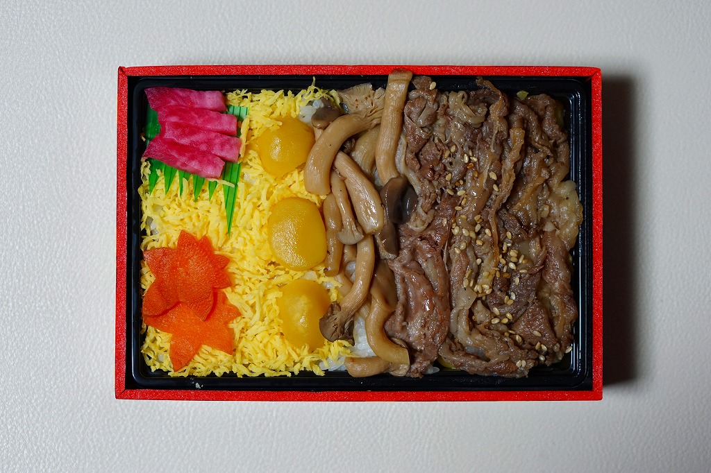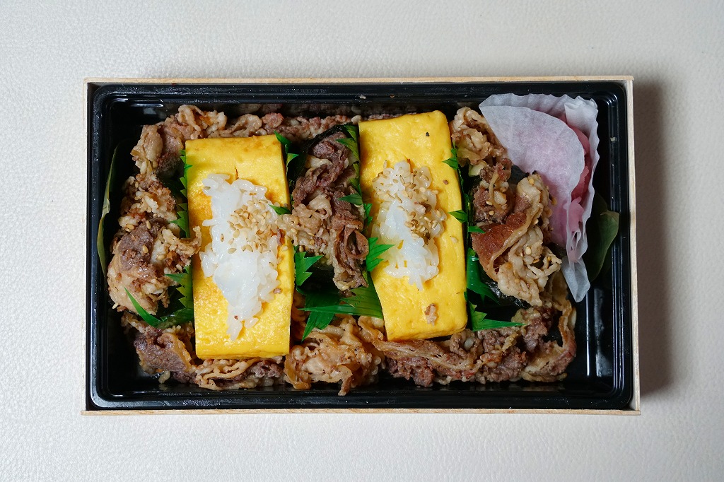 2019(平成31)年4月の発売か。酢飯に牛肉を載せて海苔で巻く軍艦巻3個と、大きな玉子焼に極小の酢飯を載せたもの2個を交互に並べ、小柄な長方形の容器のすき間を牛肉で埋める。御飯入りの駅弁なのにほとんど御飯が入っていない、個性的なレイアウト。高級なものとは思えない牛肉に、適度な厚みと噛み切りやすさと、常温でも強力な焼肉の香りを持たせているのは、最近のこの調製元の特徴だと思う。半年間ほどの販売か。