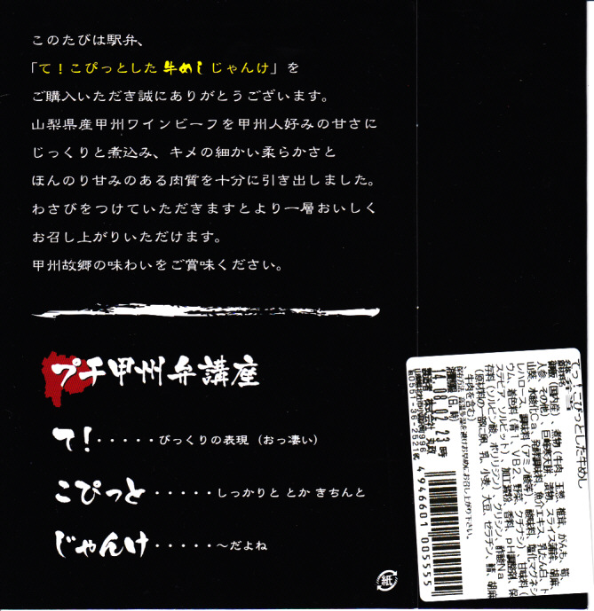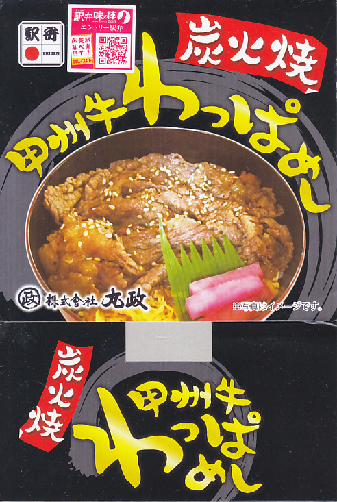 2014(平成26)年7月の発売。不思議な駅弁の名前は甲州弁のようで、「おっ!しっかりした牛めしじゃないか」の意か。中身は全国各地の牛肉駅弁と同じく、白飯を牛肉煮で覆うもの。山梨県産甲州ワインビーフを使い、白ごまを振り、シイタケ煮とタケノコ煮と糸こんにゃくを添え、巨峰寒天餅や漬物などを添える。佃煮や時雨煮のような硬めの牛肉はとても甘辛く、飯が進むとも思い、舌と胃に重すぎるなとも思い。1年間ほどの販売か。