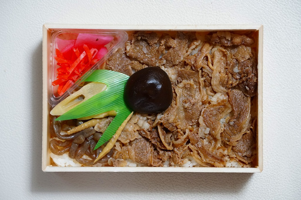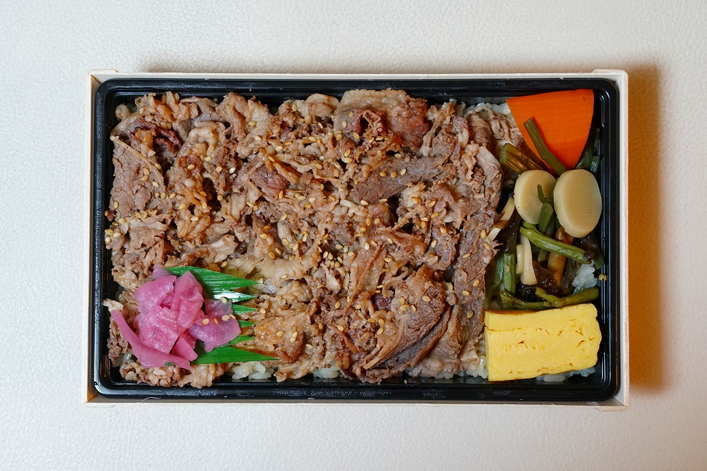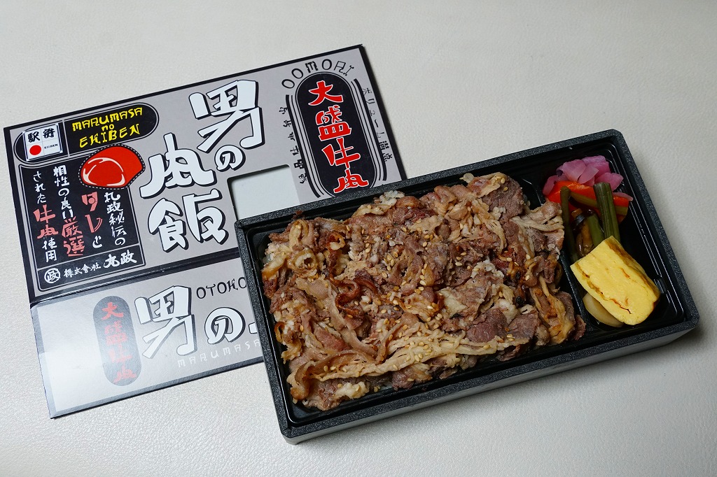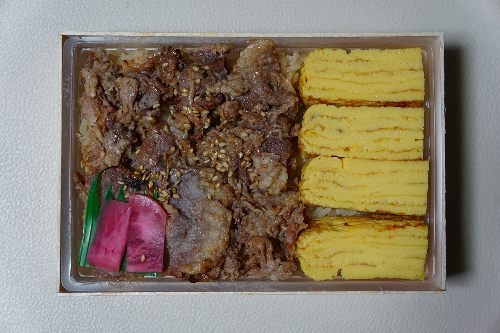 2018(平成30)年の秋に「大盛牛肉男の肉飯」の名前で、スーパーの駅弁大会などで発売か。白飯を牛焼肉で覆い、玉子焼、煮物、山菜、大根桜漬を添える、書けば普通の牛肉駅弁。駅弁の名前にあるとおり、たしかにパサついた見栄えとふわふわな食感の牛肉は多めで、この調製元の近年の牛肉駅弁と同じく、焼肉の香りが強烈。2020年の夏頃までの販売か。