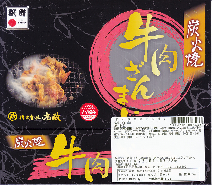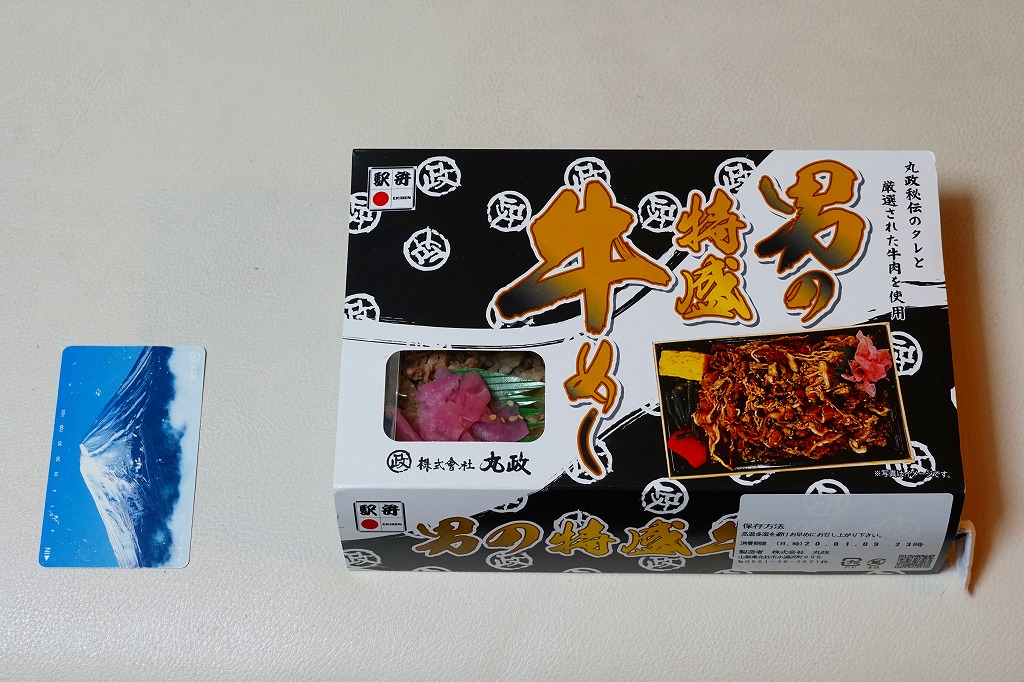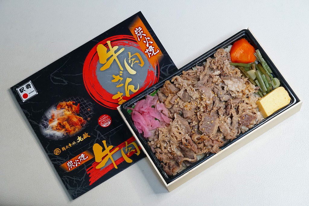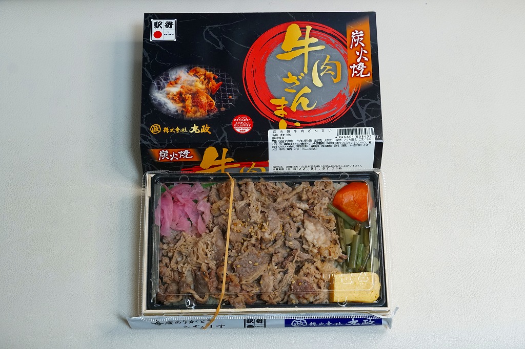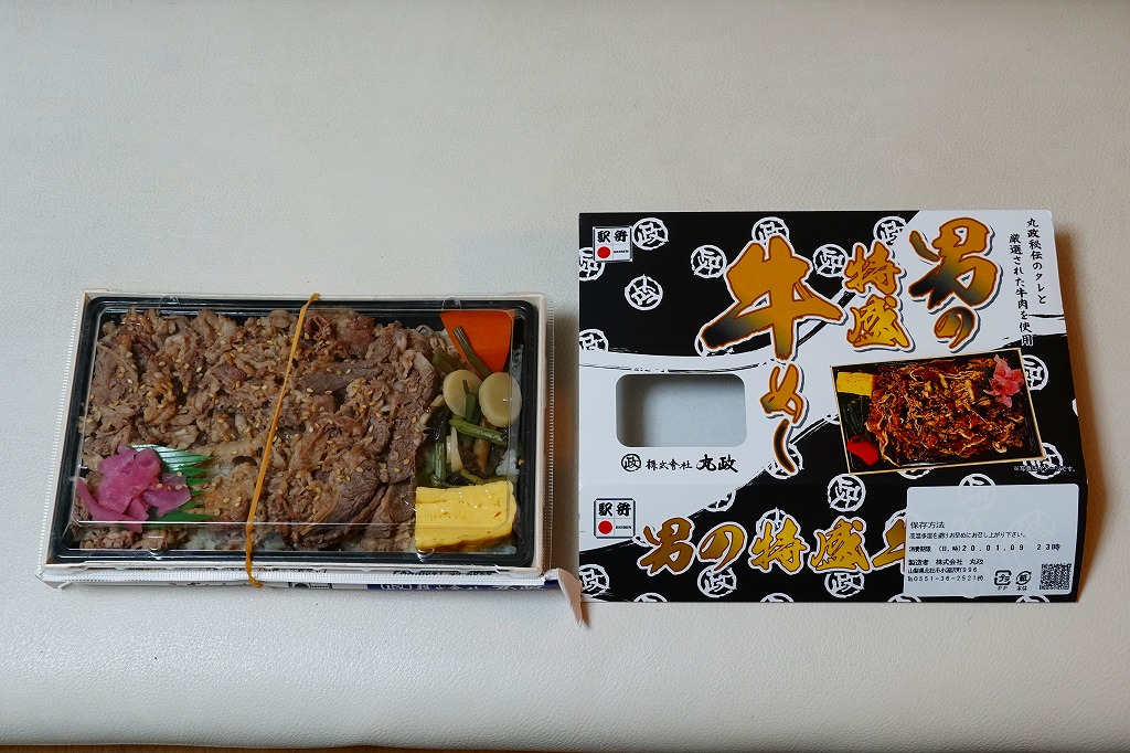 2018(平成30)年の秋に「大盛牛肉男の肉飯」の名前で、スーパーの駅弁大会などで発売か。白飯を牛焼肉で覆い、玉子焼、煮物、山菜、大根桜漬を添える、書けば普通の牛肉駅弁。駅弁の名前にあるとおり、たしかにパサついた見栄えとふわふわな食感の牛肉は多めで、この調製元の近年の牛肉駅弁と同じく、焼肉の香りが強烈。2020年の夏頃までの販売か。