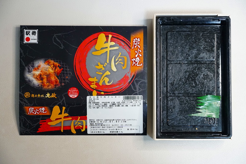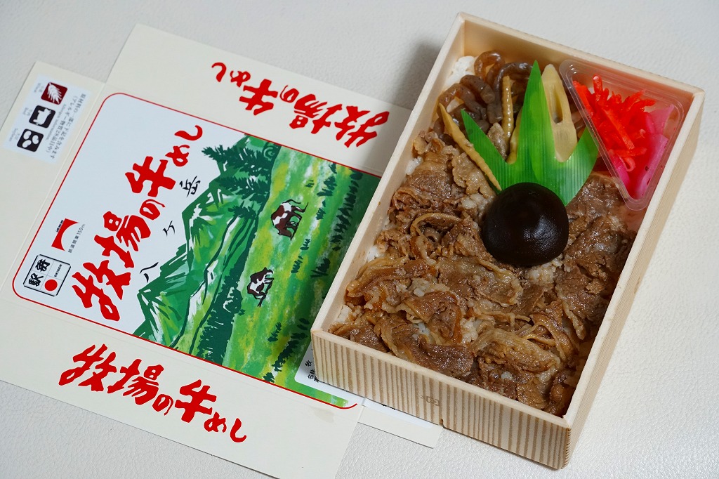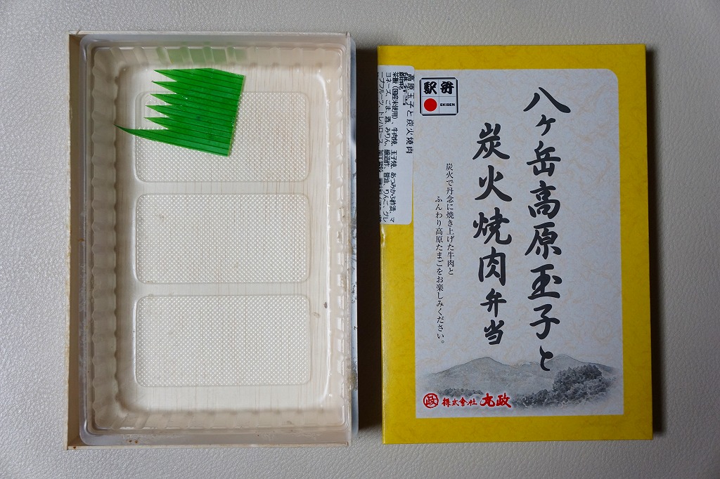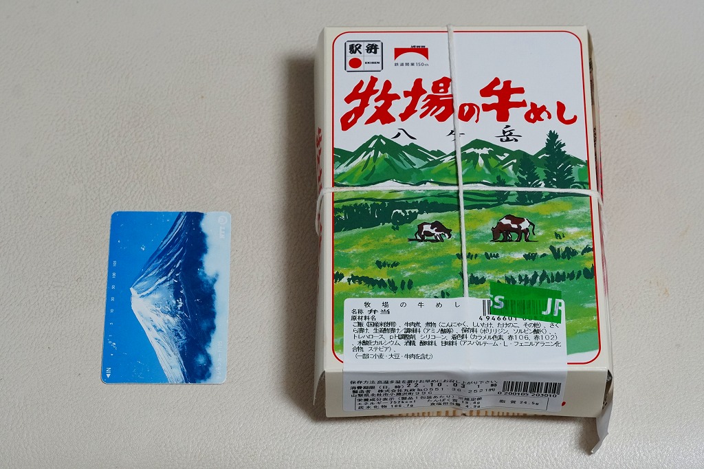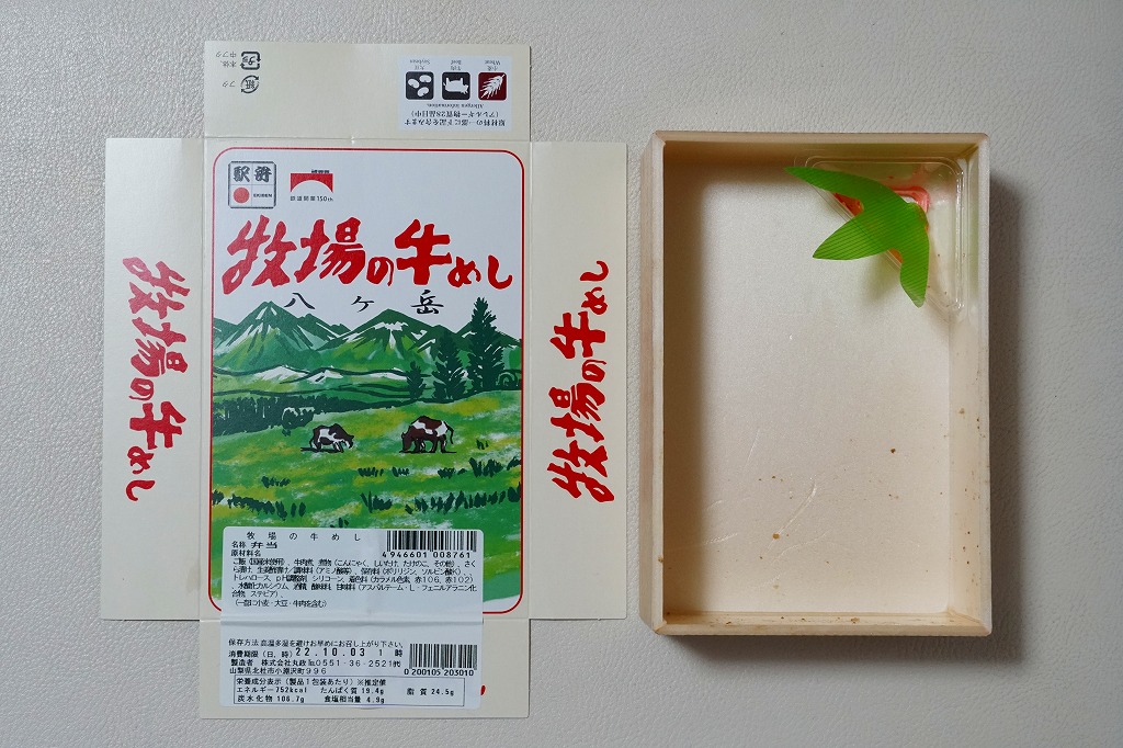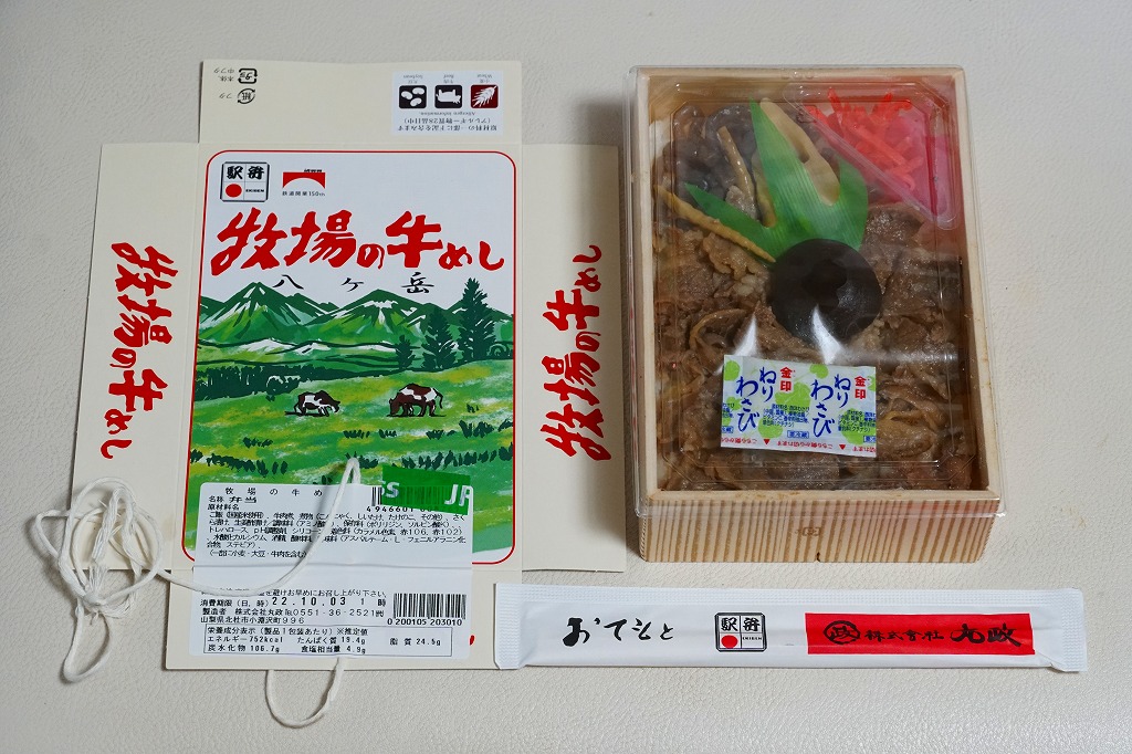 2022(令和4)年10月1日に、小淵沢駅と甲府駅と東京駅で発売か。同日からのJR東日本の駅弁キャンペーン「駅弁味の陣2022」にエントリー。20年前に販売していた駅弁の復刻版とされたが、もう少し古い1990年前後、30年以上前のものではないかと思う。ふたの絵柄は、八ヶ岳と牧場のイメージか。四角い容器に白飯を詰め、牛肉煮で覆い、こんにゃく、しいたけ、ひめたけ、紅生姜、大根桜漬、金印ねりわさびを添える。上等でなく並等の分量と品質と価格を持たせた、すき焼き風かもしれない牛丼弁当。